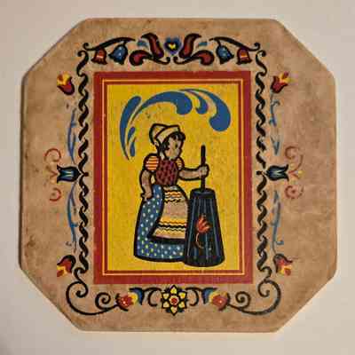 Roofing - Roof Repair - Siding - Combination Windows - Insulation - Zephyr Awnings"; this is printed on back of the trivet which has a painted Dutch scene - a little Dutch girl drawing water from a well - on the front.Acquisition
