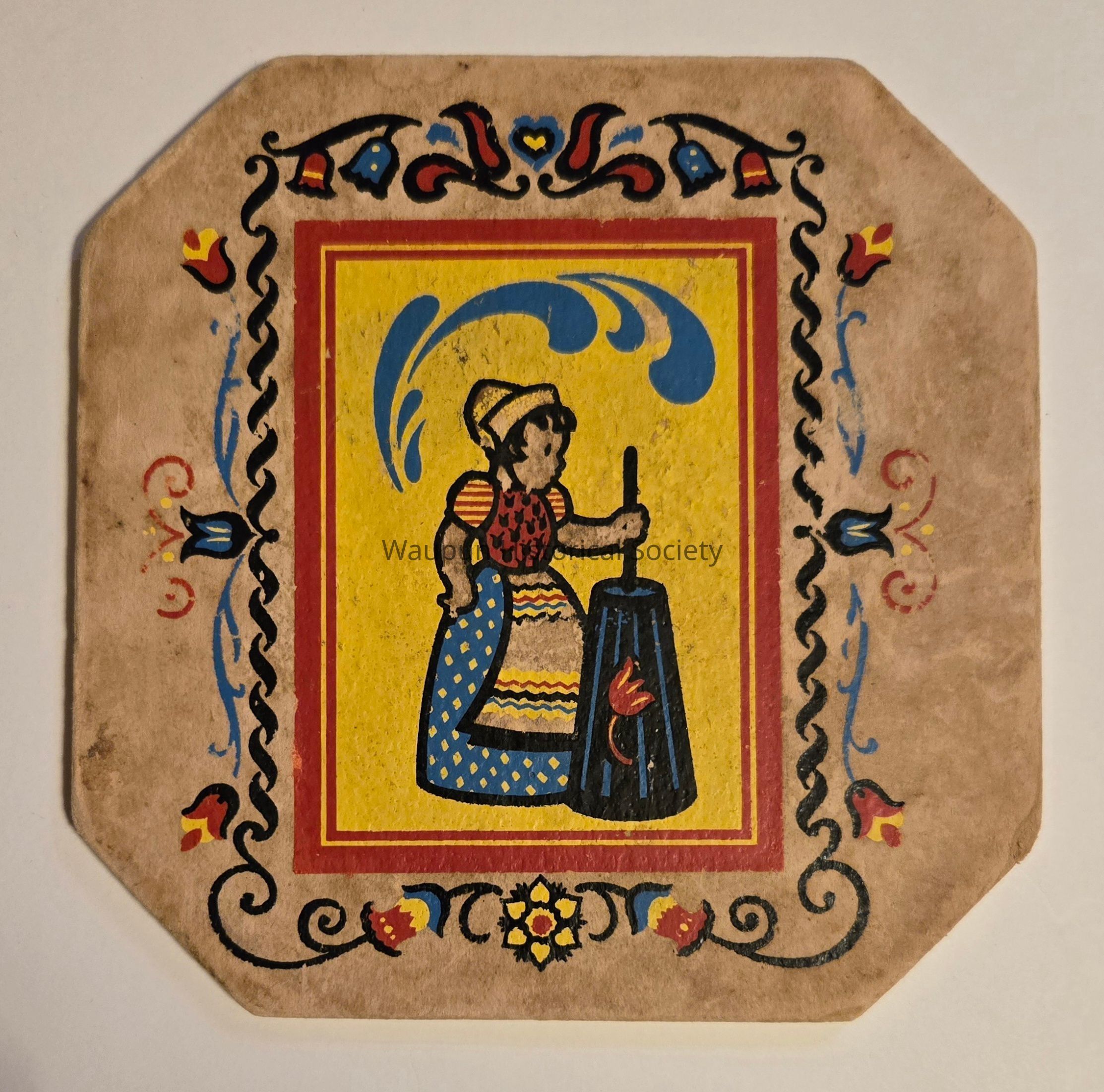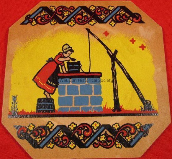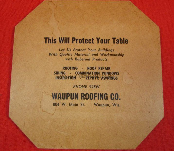 An octagon shaped trivet used to protect table tops advertising Waupun Roofing Co., 804 W. Main St., Waupun, Wis. Phone 928W.
