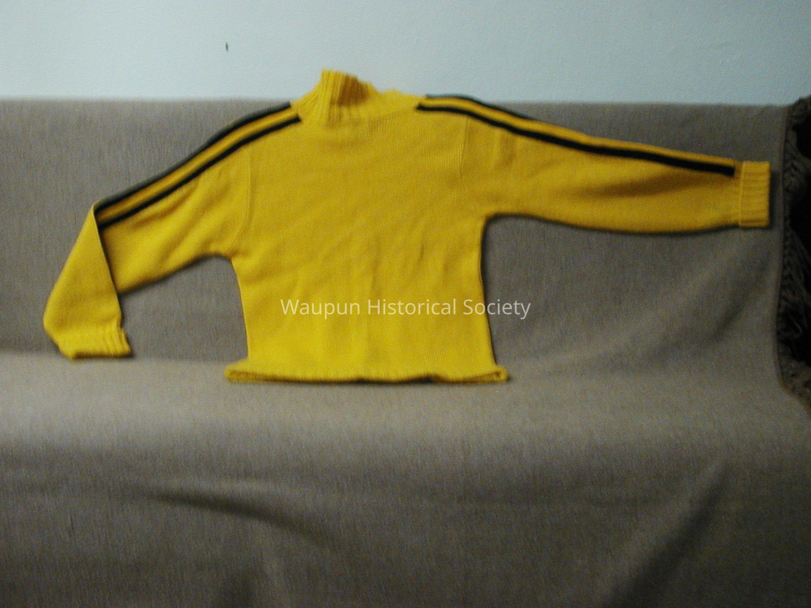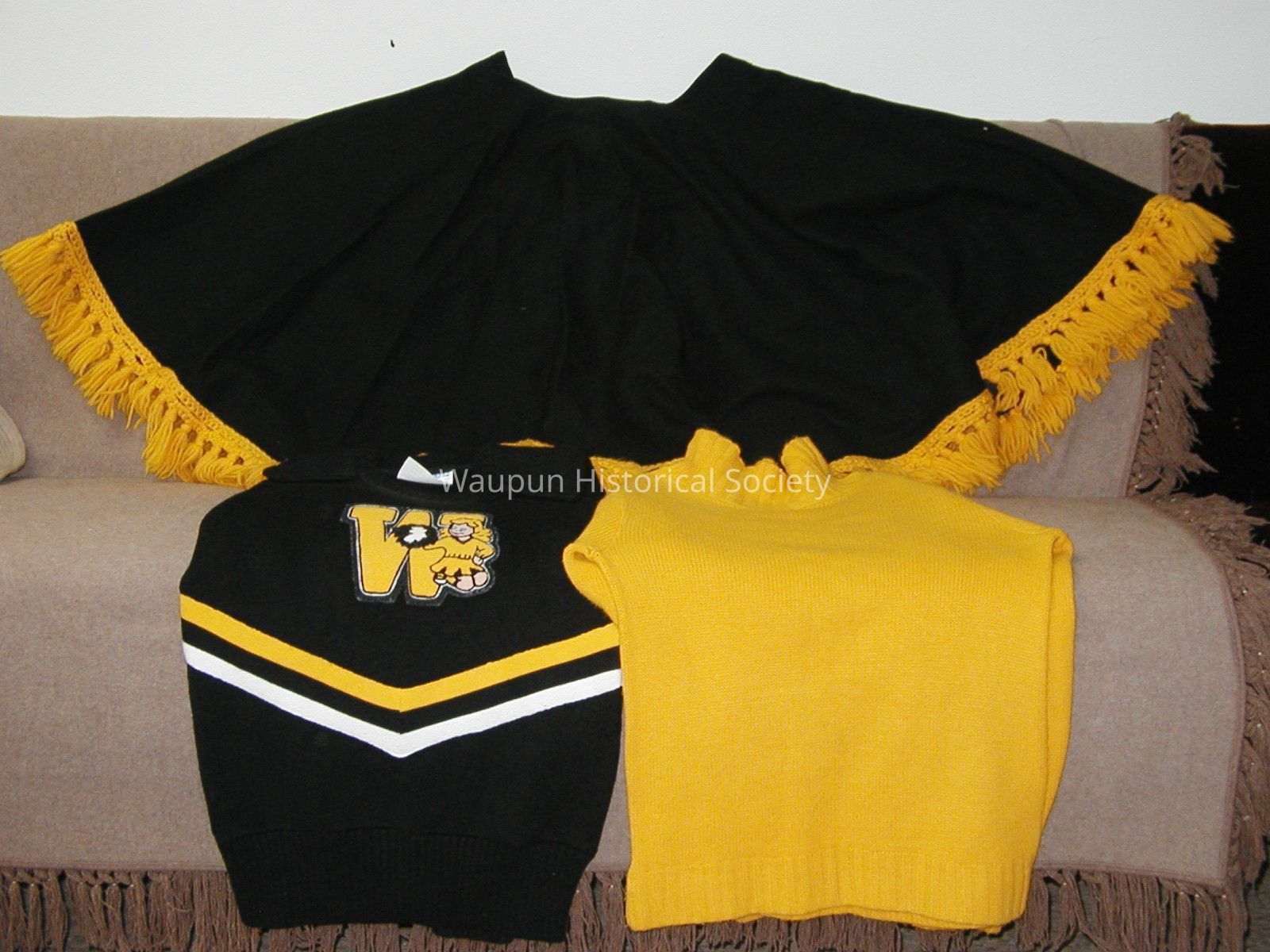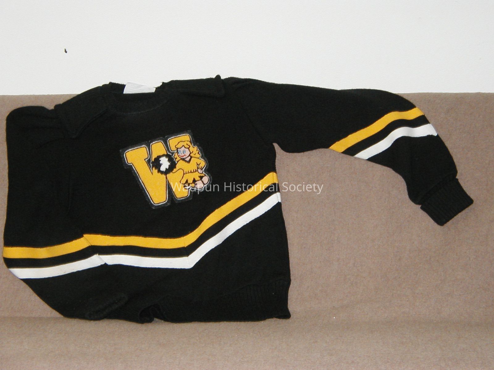 Couldn't find the year or what sport this was used for. The articles are two sweaters made of wool, one with a W on the front and a girl in a cheerleader uniform and the other is sold gold with black stripes on the arms.