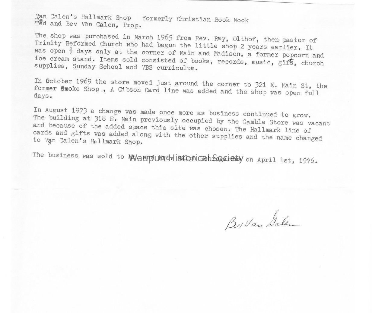 Historical information on VanGalen's Hallmark Shop for 1976 Bicentennial Celebration in Waupun, WI.