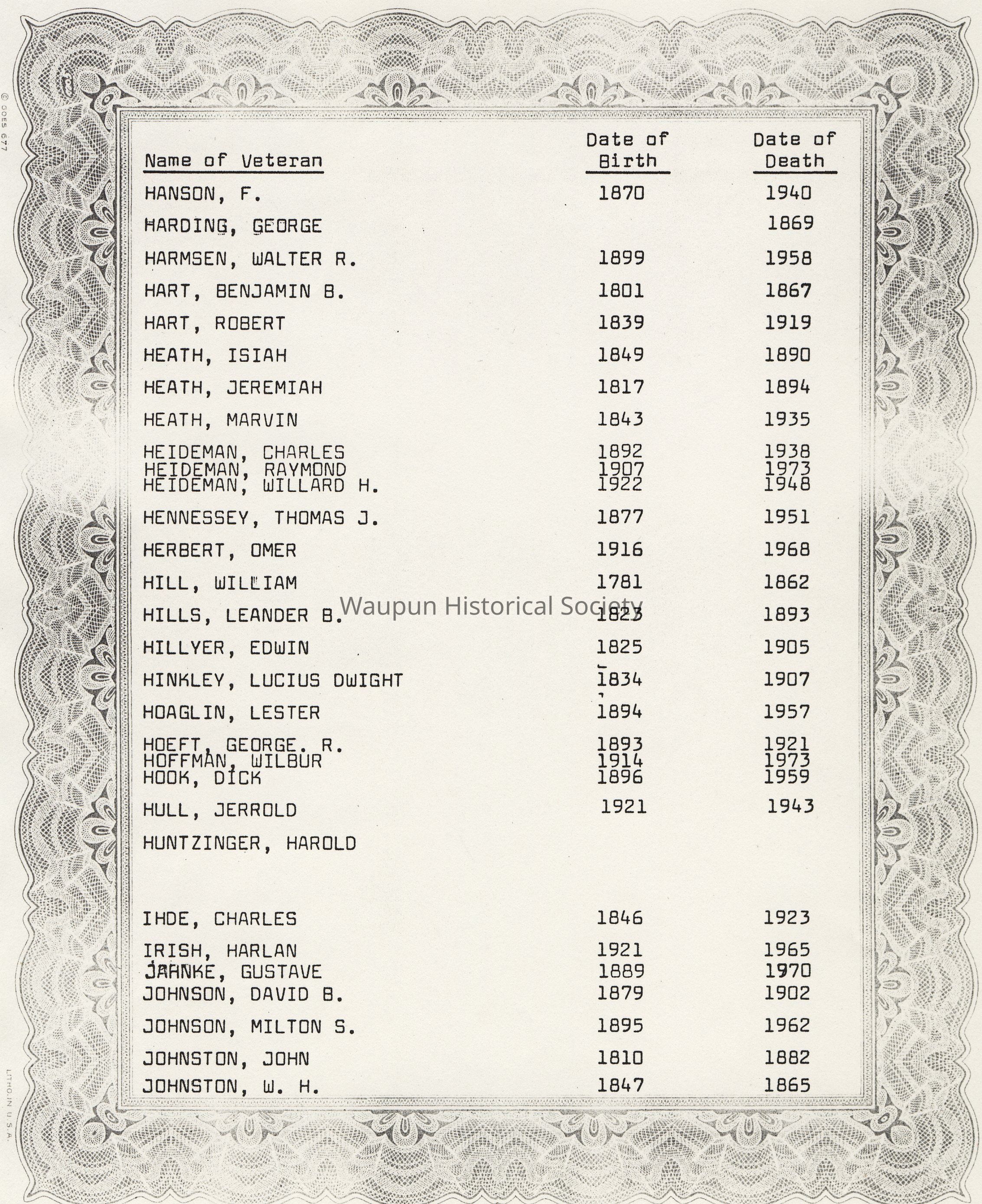Name of Veteran, Date of Birth, Date of Death