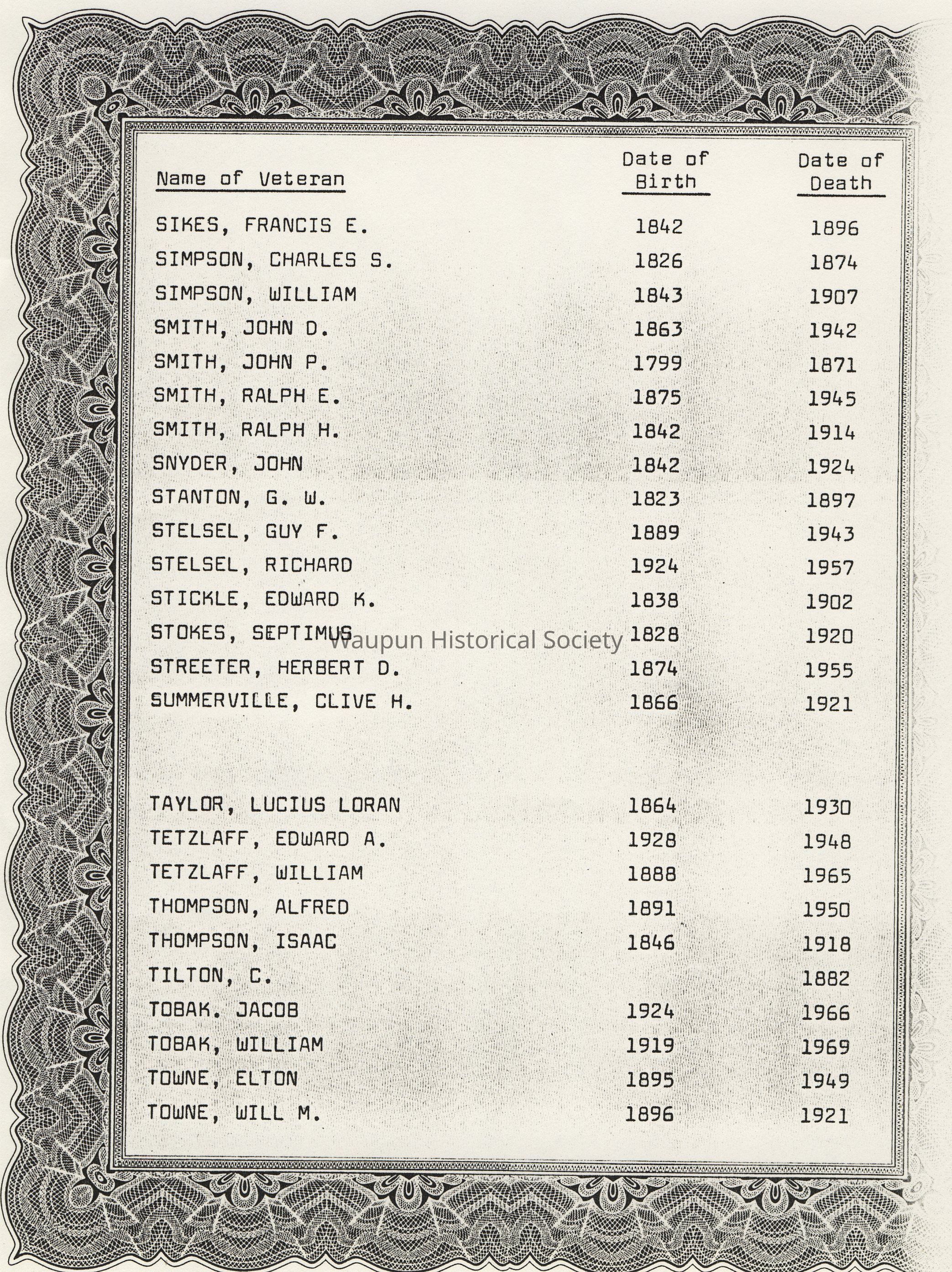 Name of Veteran, Date of Birth, Date of Death
