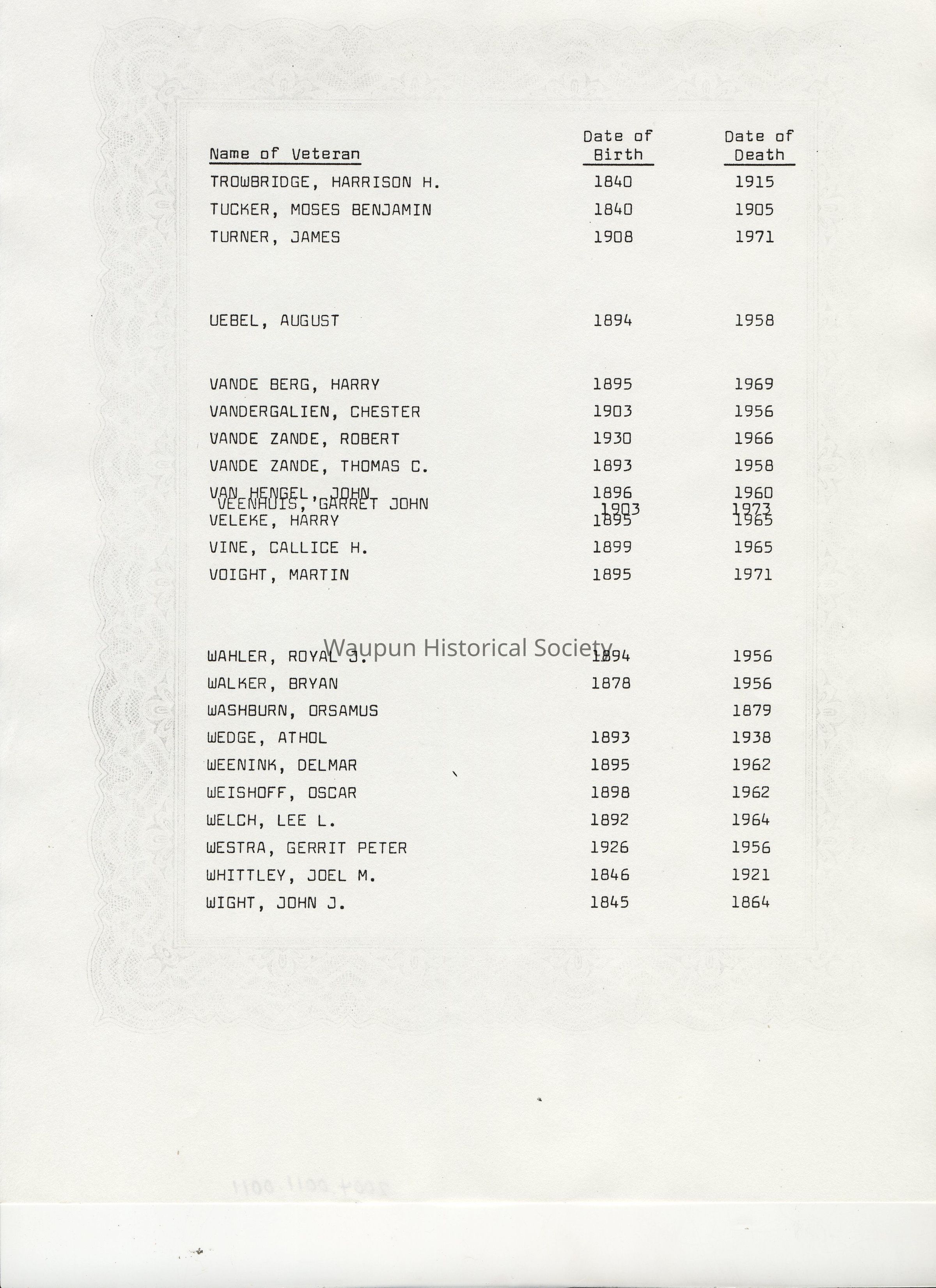 Veterans Buried at Forest Mound Cemetery: Waupun, Wisconsin. Page 11.