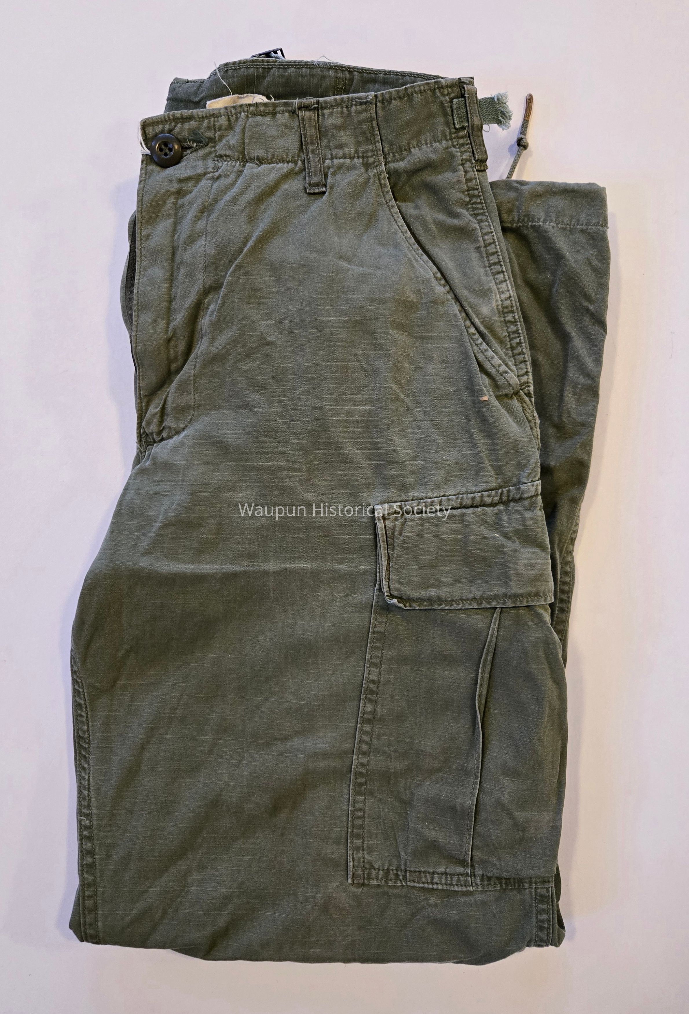 Vietnam war era Green Jungle Fatigue Pants. Very worn. Have zipper fly and button in front with ties at the bottom of each leg. Also has cargo pockets on outside of each leg.Acquisition