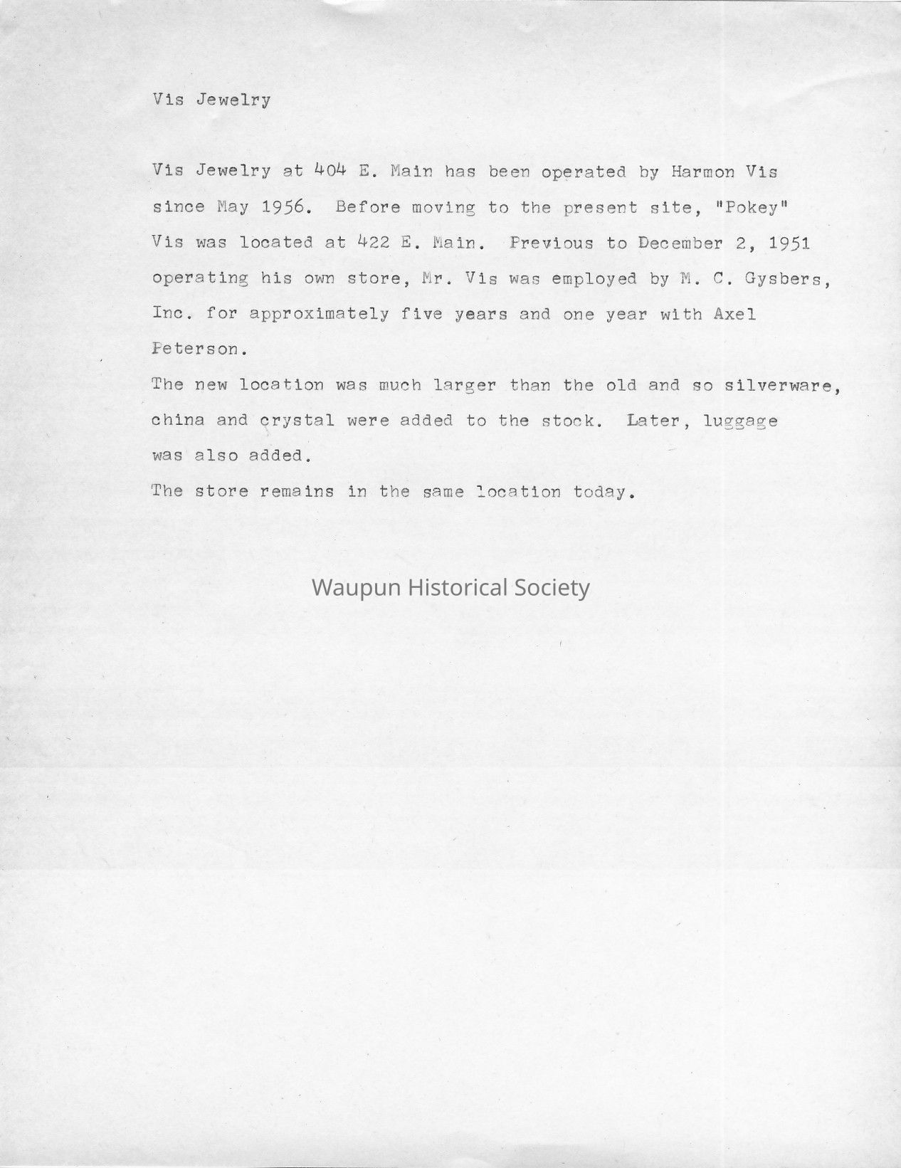 Vis Jewelry at 404 E. Main has been operated by Harmon Vis since May 1956. Before moving to the present site, "Pokey" Vis was located at 422 E. Main. Previous to December 2, 1951 operating his own store, Mr. Vis was employed by M. C. Gysbers, Inc. for approximately five years and one year with Axel Peterson.
