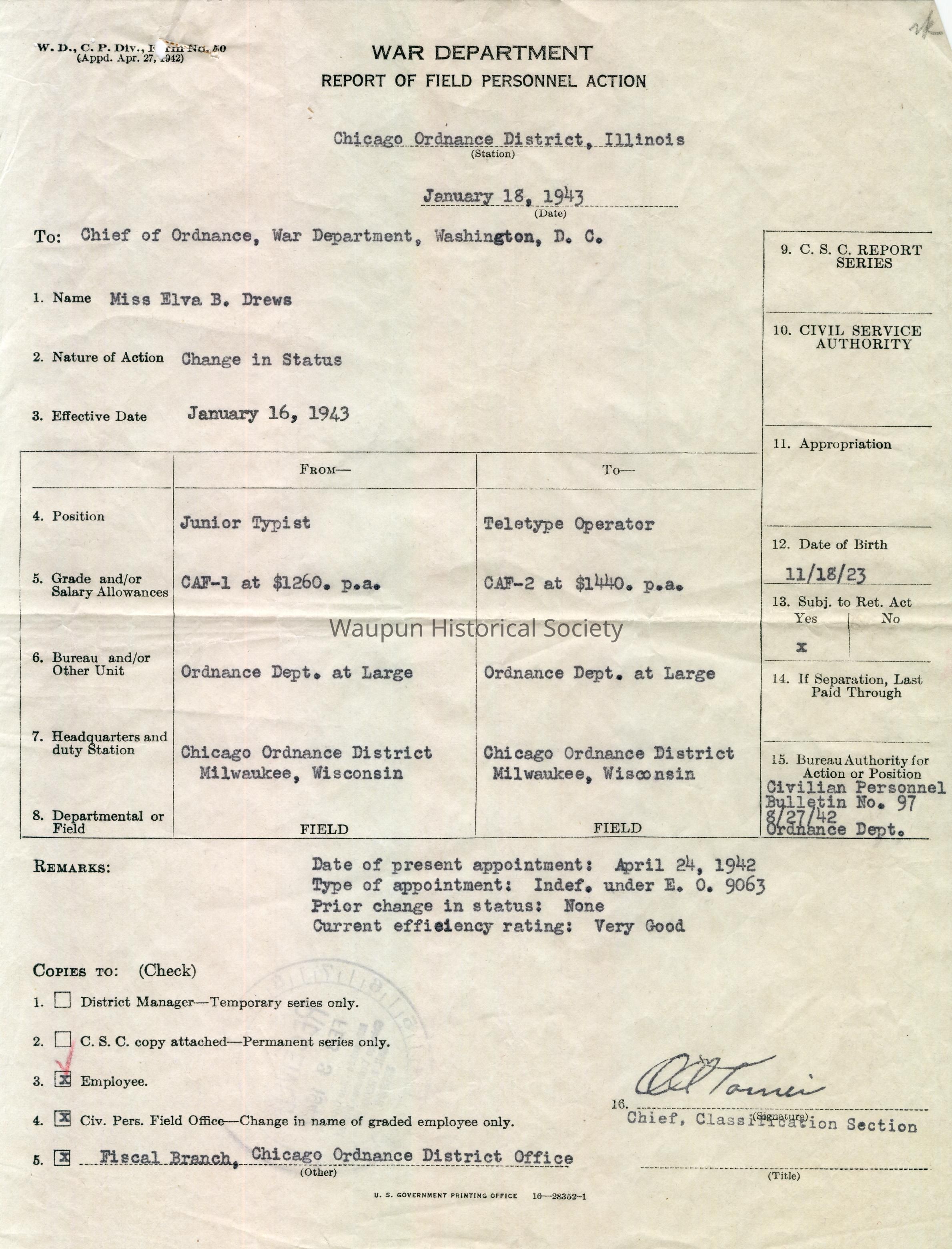 War Department, WWII, Elva Drews Change in Military StatusEntry/Object ID