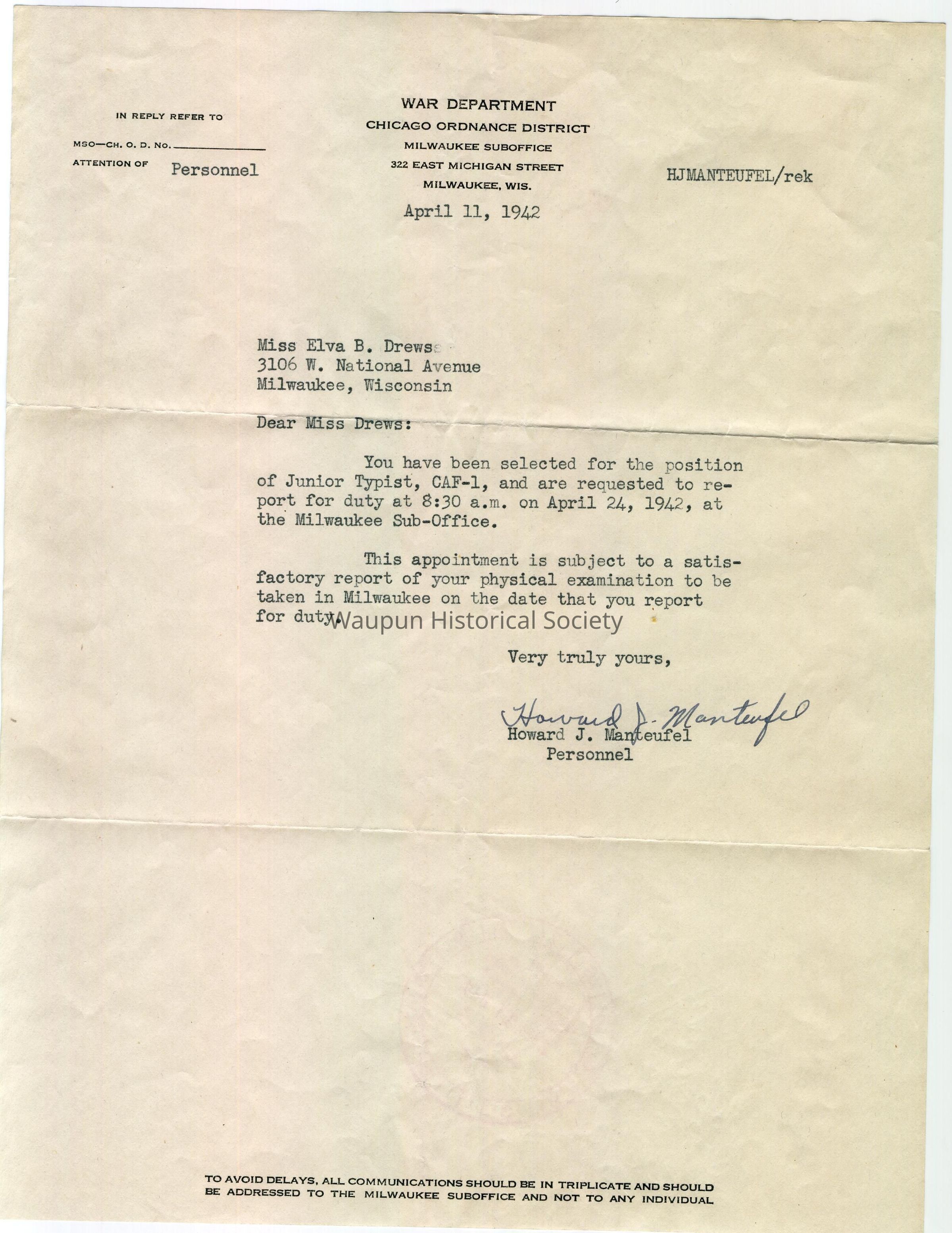 You have been selected for the position of Junior Typist, CAF-l, and are requested to report for duty at 8:30 a.m. on April 24, 1942, at the Milwaukee Sub-Office.