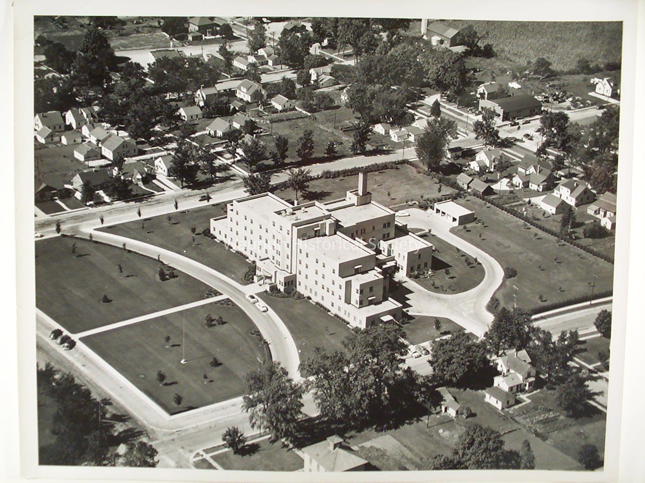 Waupun 1950's aerial photos. Given by John Kirkpatrick who was the editor of the Waupun Leader News, for many years. Caption on the back indicates Waupun Memorial Hospital. Showing Elm Avenue, and West End Elementary School, present site of Union Congregational Church. This photo is also shown in a 5 x 7 format at 2005.0003.0028.Acquisition