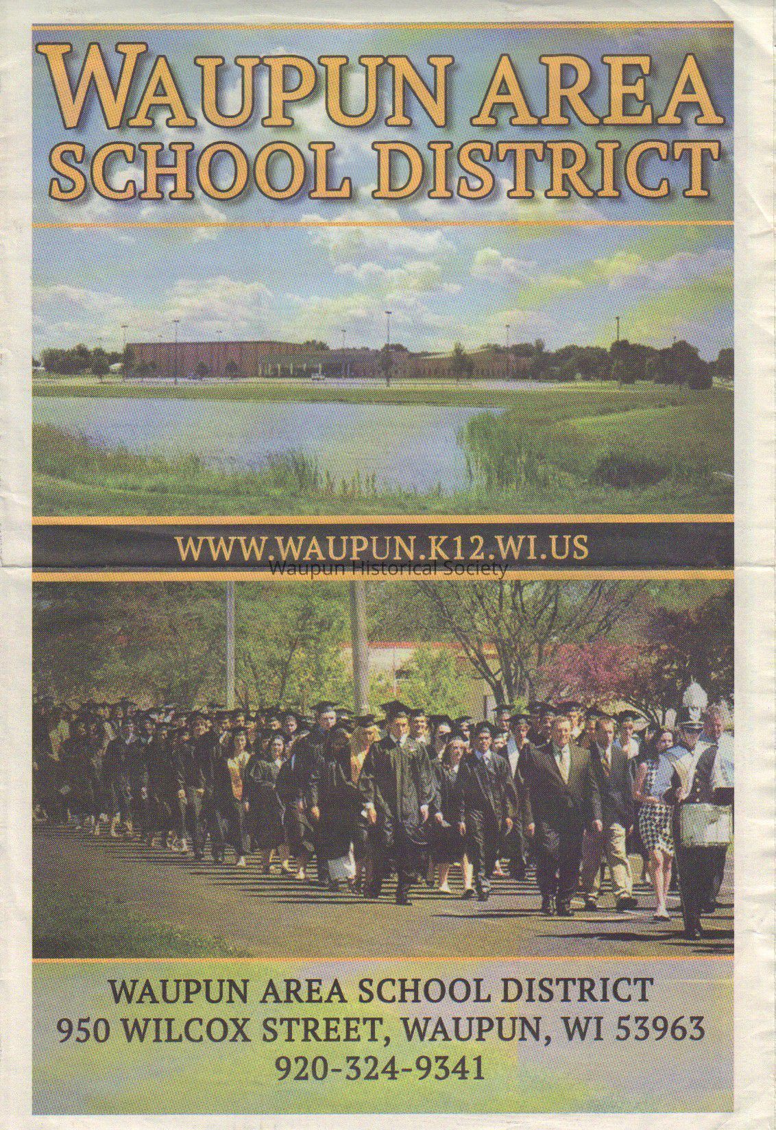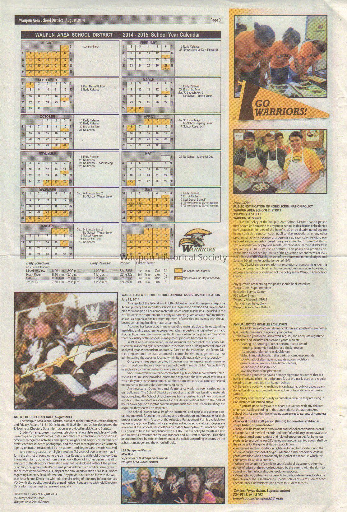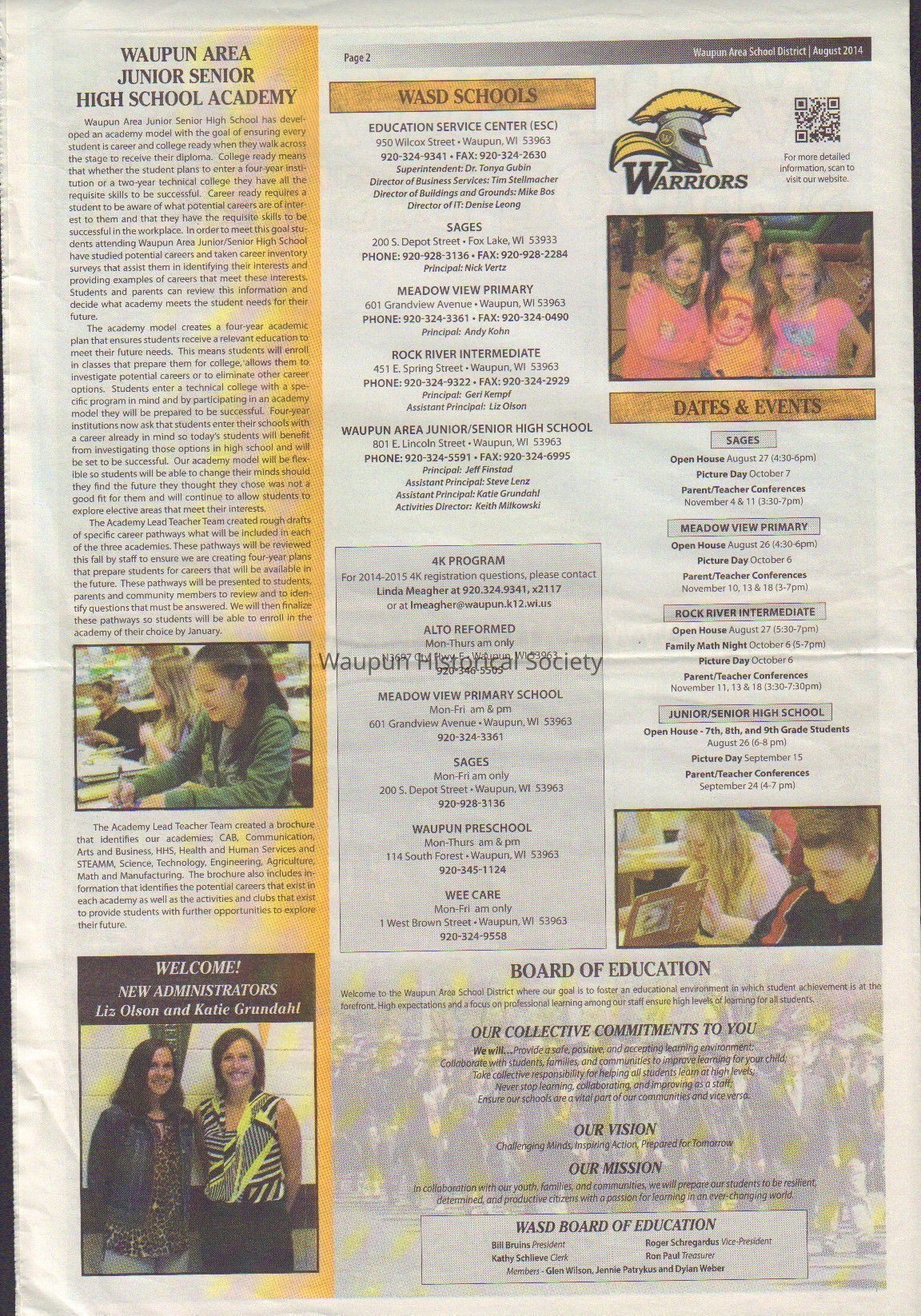 Waupun Area School District four page newspaper for the 2014 school year contains multiple pictures and a Calendar of events for the upcoming school year including "end of term" dates. New administrators and board of education members are also listed.