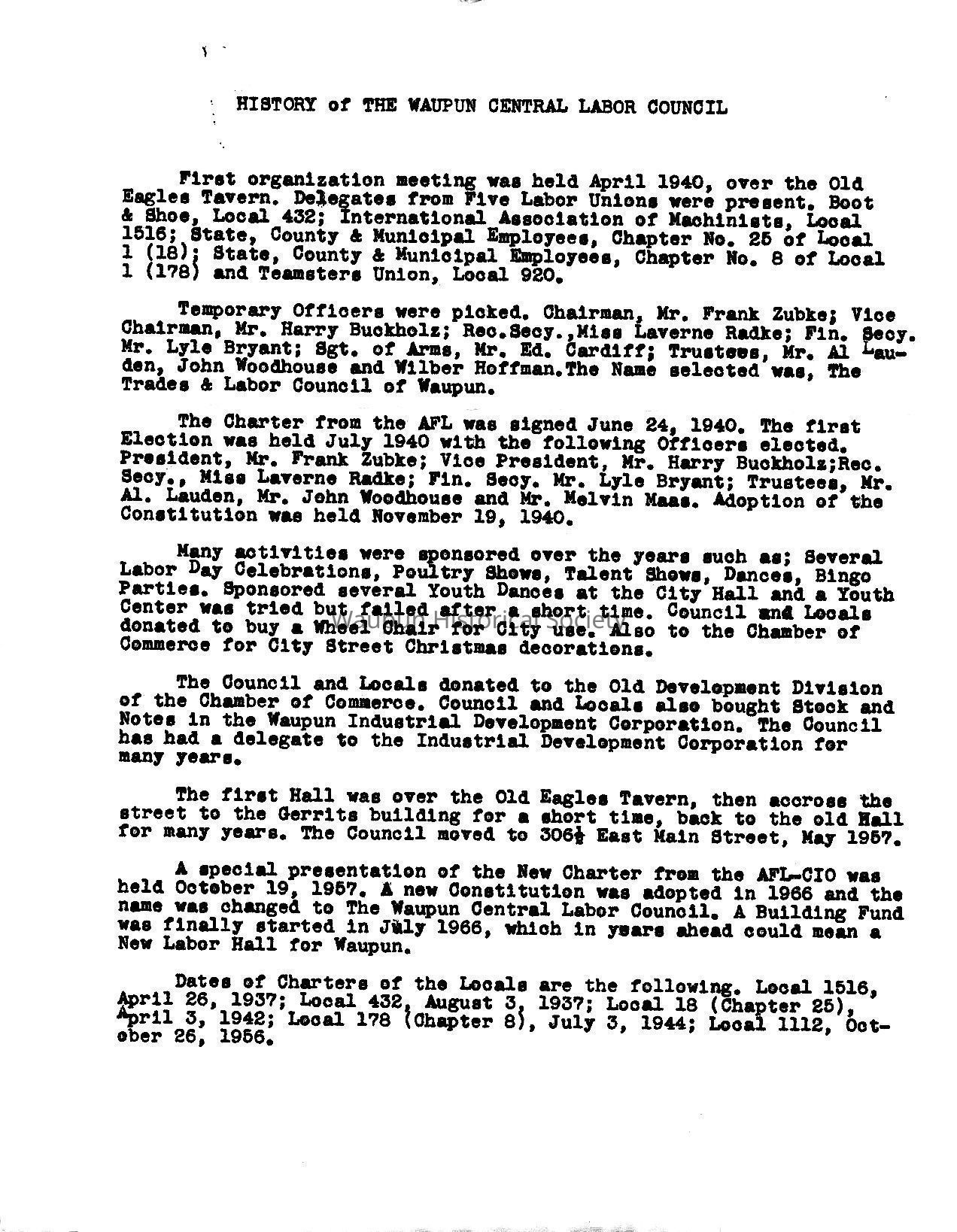 Temporary Officers were picked. Chairman, Mr. Frank Zubke; Vice Chairman, Mr. Harry Buckholz; Rec. Secy.,Miss Laverne Radke; Fin. Secy. Mr. Lyle Bryant; Sgt. of Arms, Mr. Ed. Cardiff; Trustees, Mr. Al Lauden, John Woodhouse and Wilber Hoffman. The Name selected was, The Trades & Labor Council of Waupun.