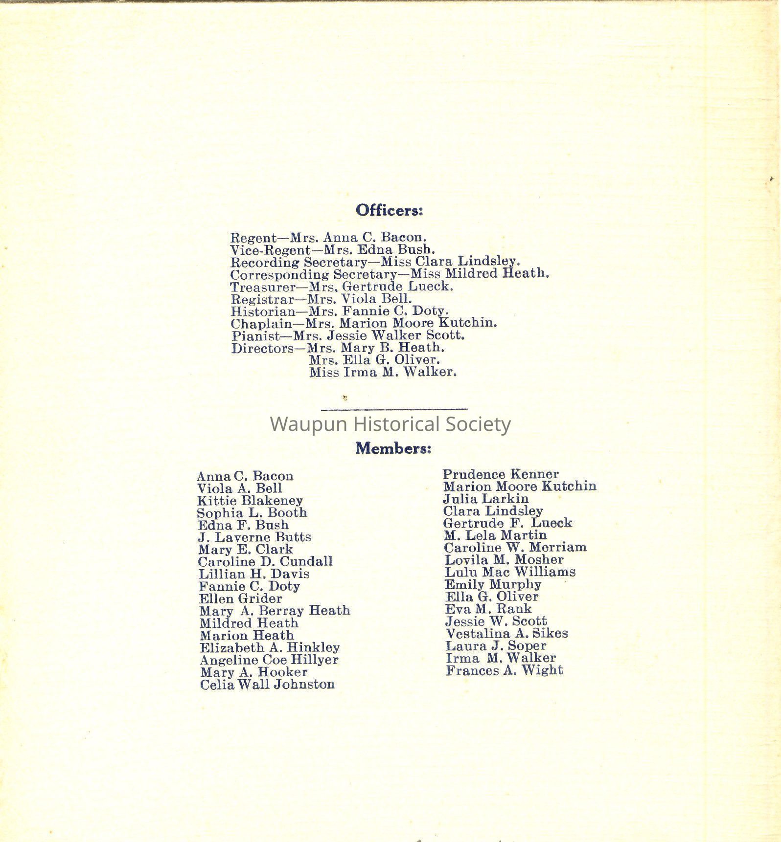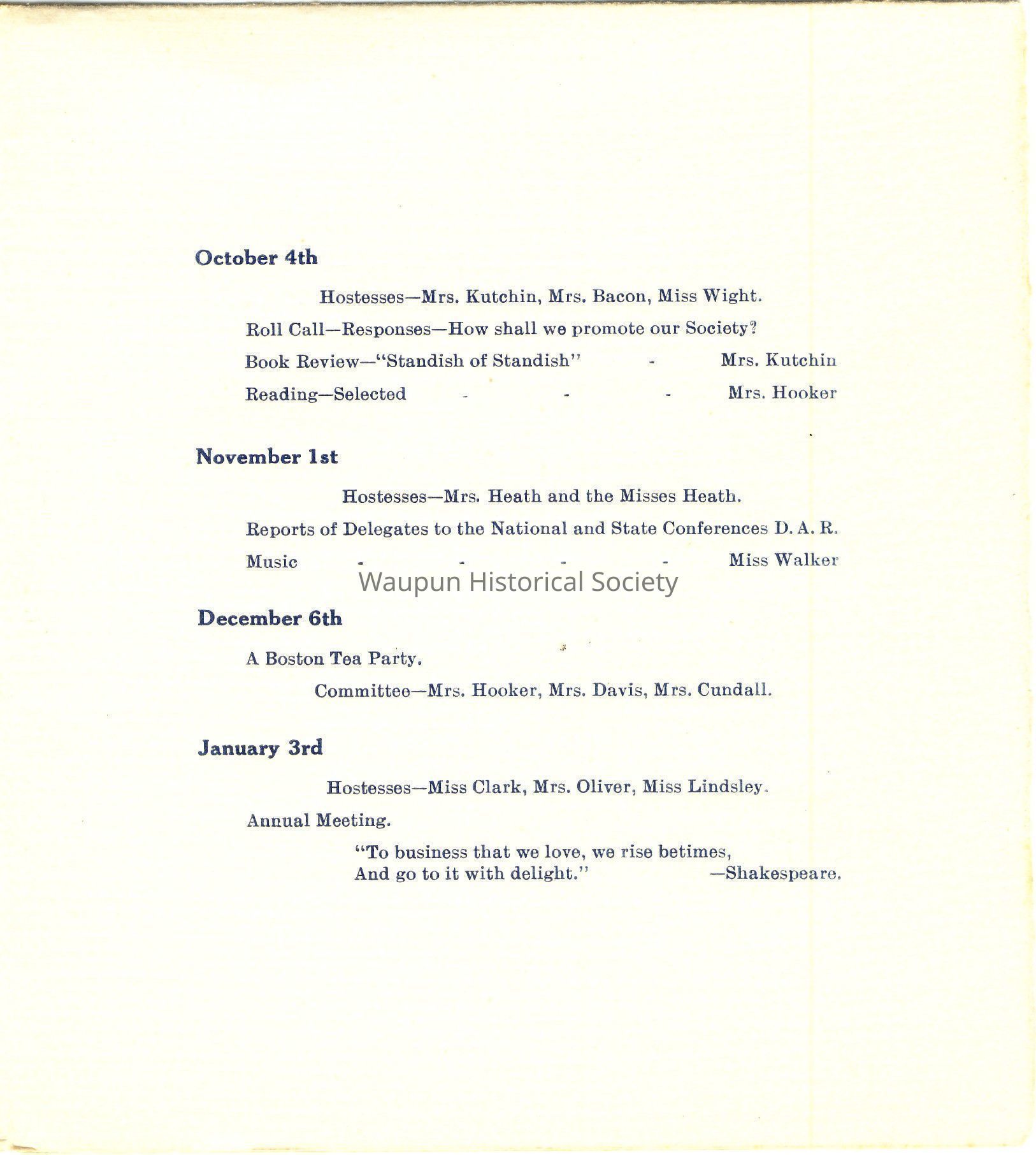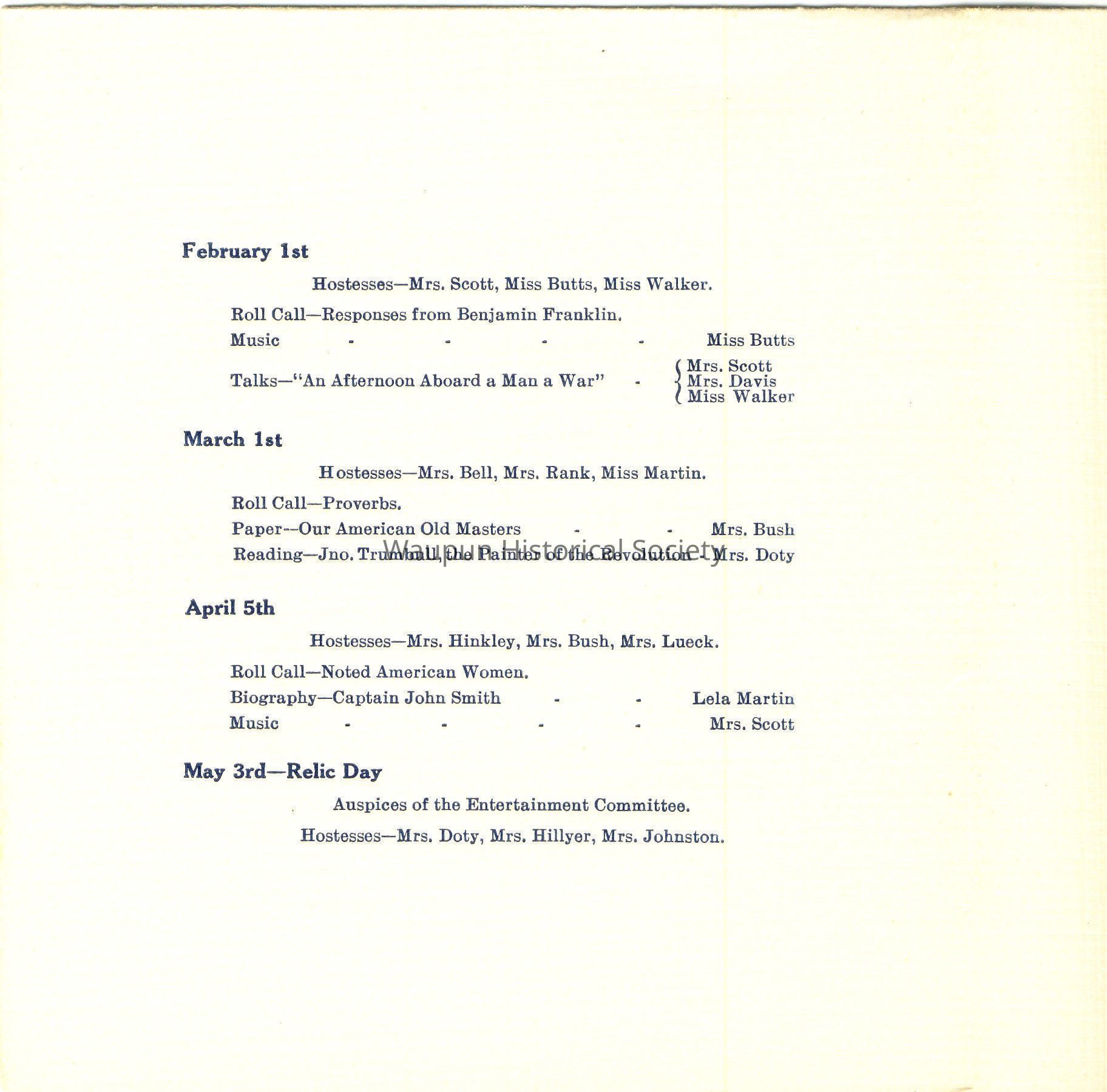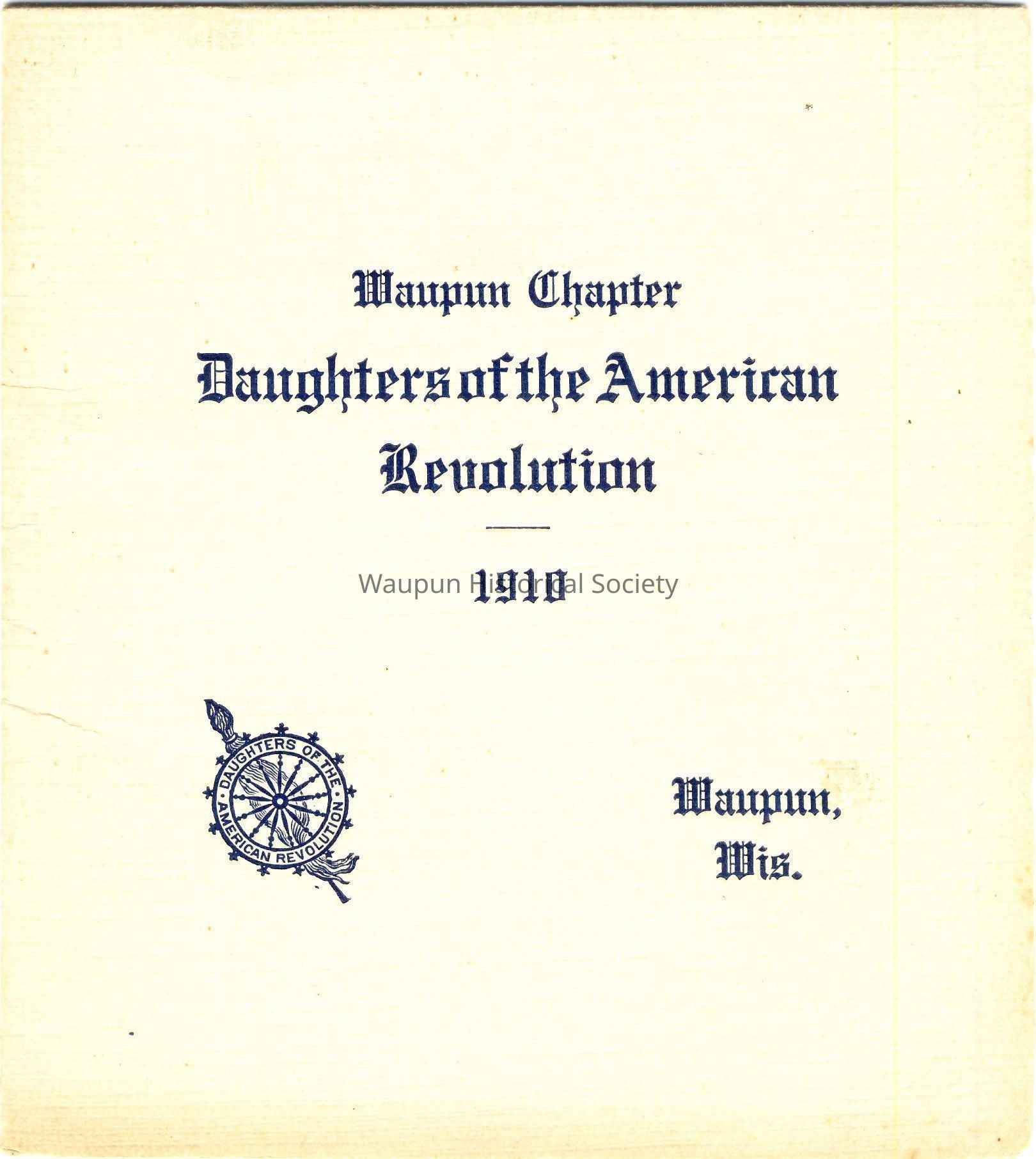 Program, Waupun Chapter Daughters of the American Revolution, DAR, 1910Entry/Object ID