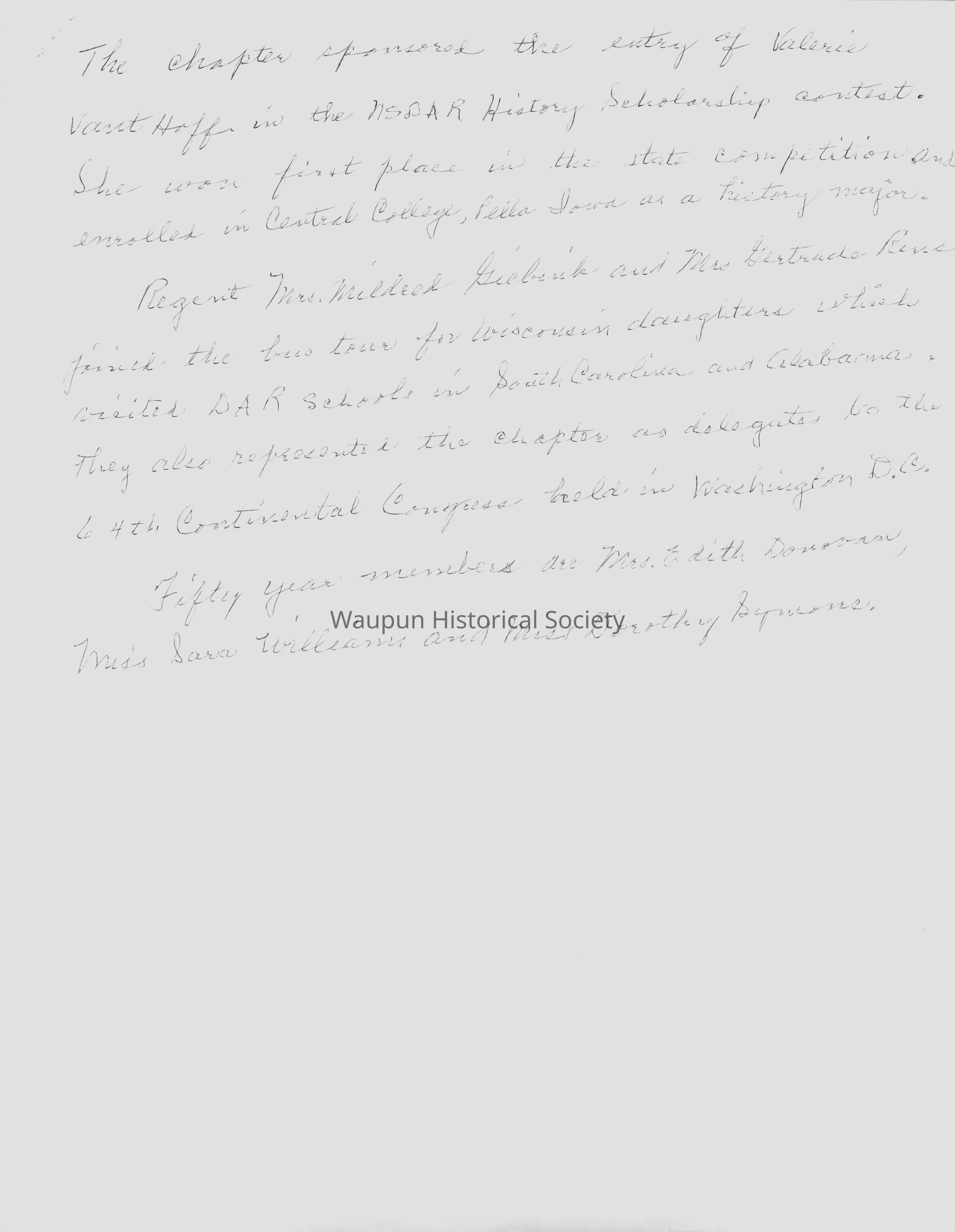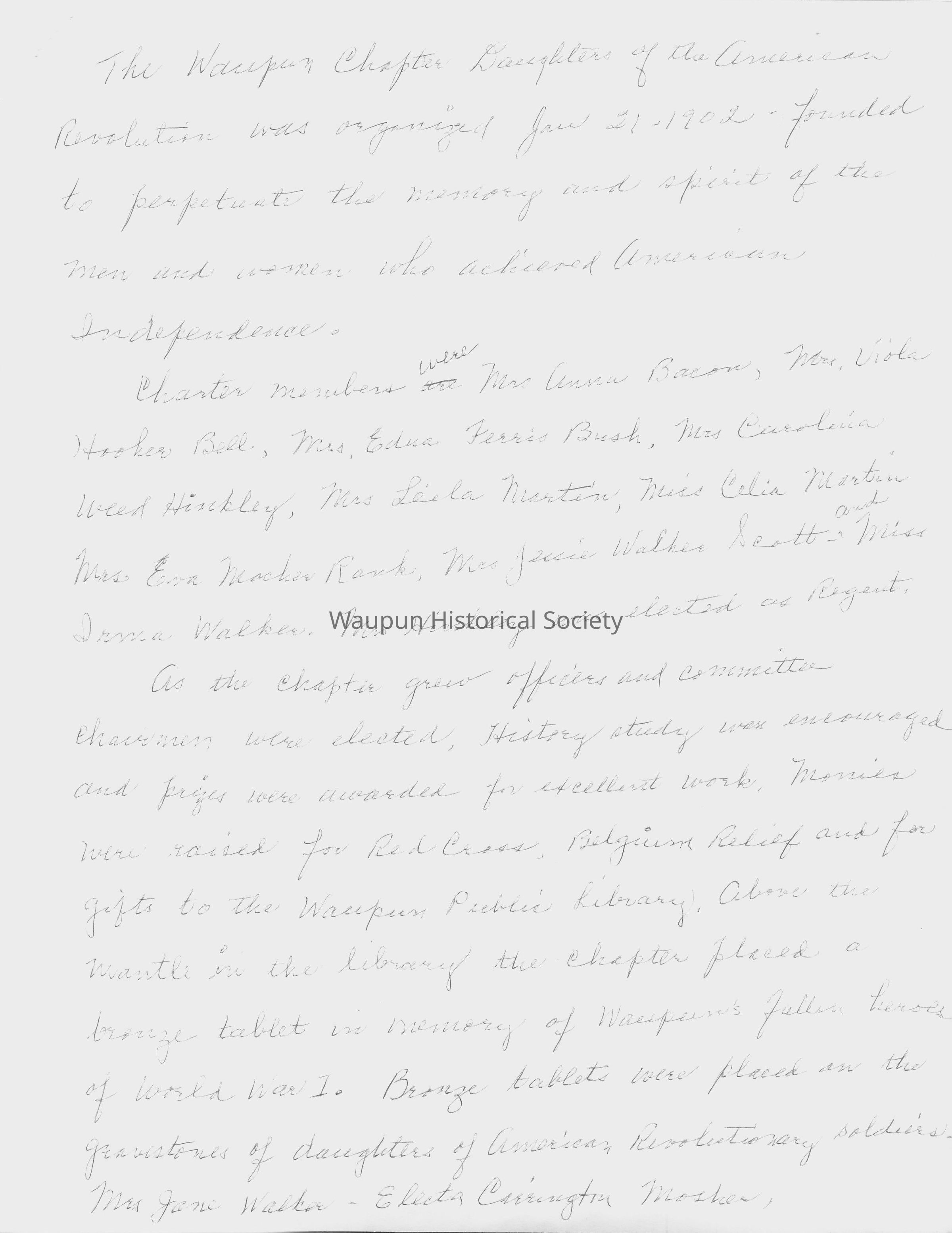 Historical information on Waupun Chapter Daughters of the American Revolution for 1976 Bicentennial Celebration in Waupun, WI
