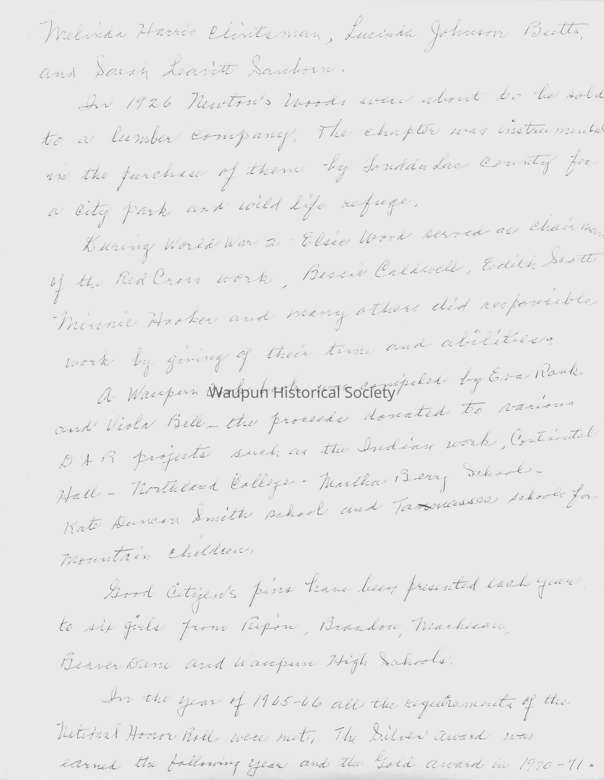 A Waupun Cook book was compiled by Eva Rank and Viola Bell and the proceeds donated to various DAR projects; such as the Indian work, Continental Hall, Northland College, Martha Berry School, Kate Duncan Smith school and Tanassee school for Mountain children.