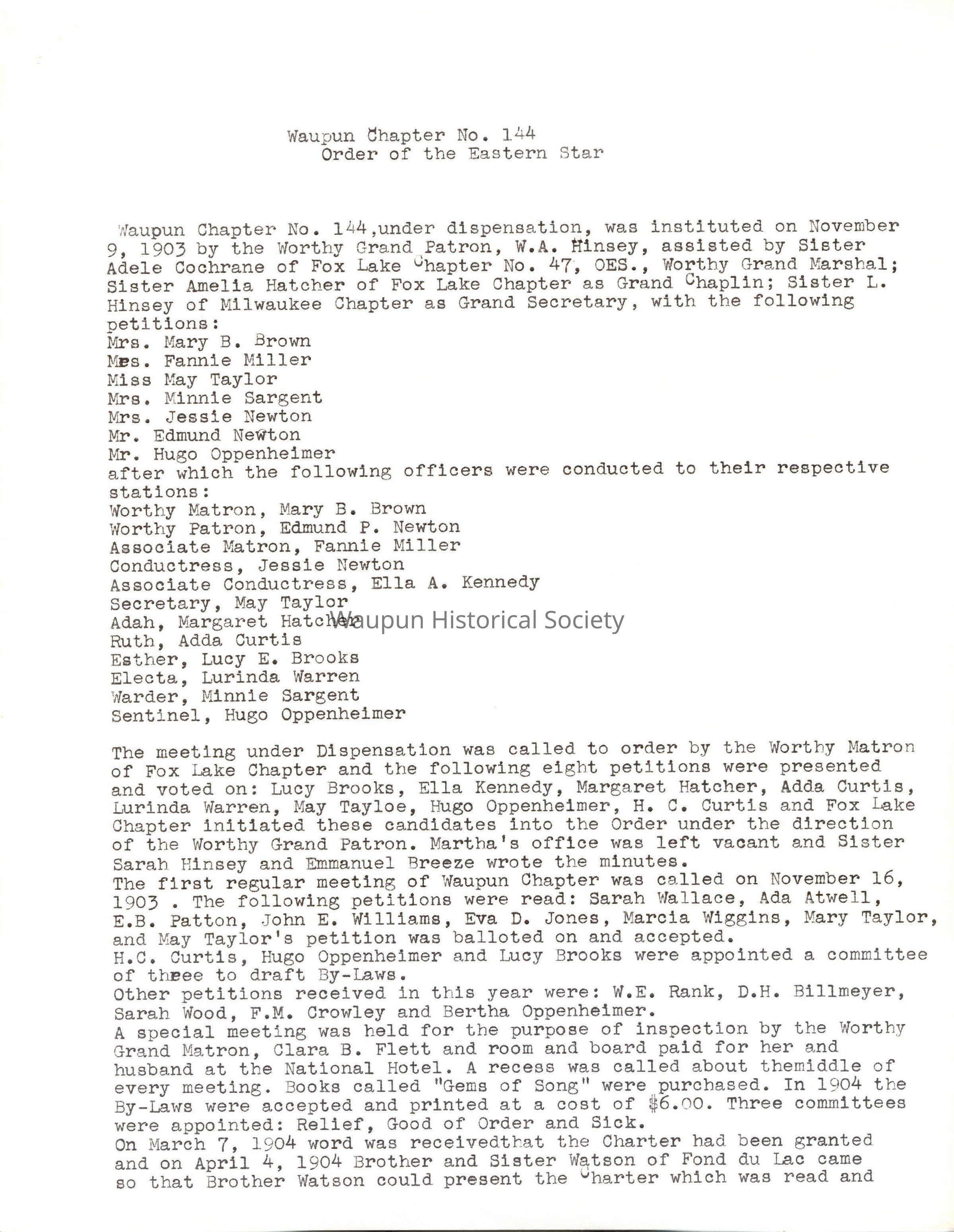 Waupun Chapter No. 144, under dispensation, was instituted on November 9, 1903 by the Worthy Grand Patron, W.A. Hinsey, assisted by Sister Adele Cochrane of Fox Lake Chapter No. 47, OES., Worthy Grand Marshal; Sister Amelia Hatcher of Fox Lake Chapter as Grand Chaplin; Sister L. Hinsey of Milwaukee Chapter as Grand Secretary, with the following petitions: