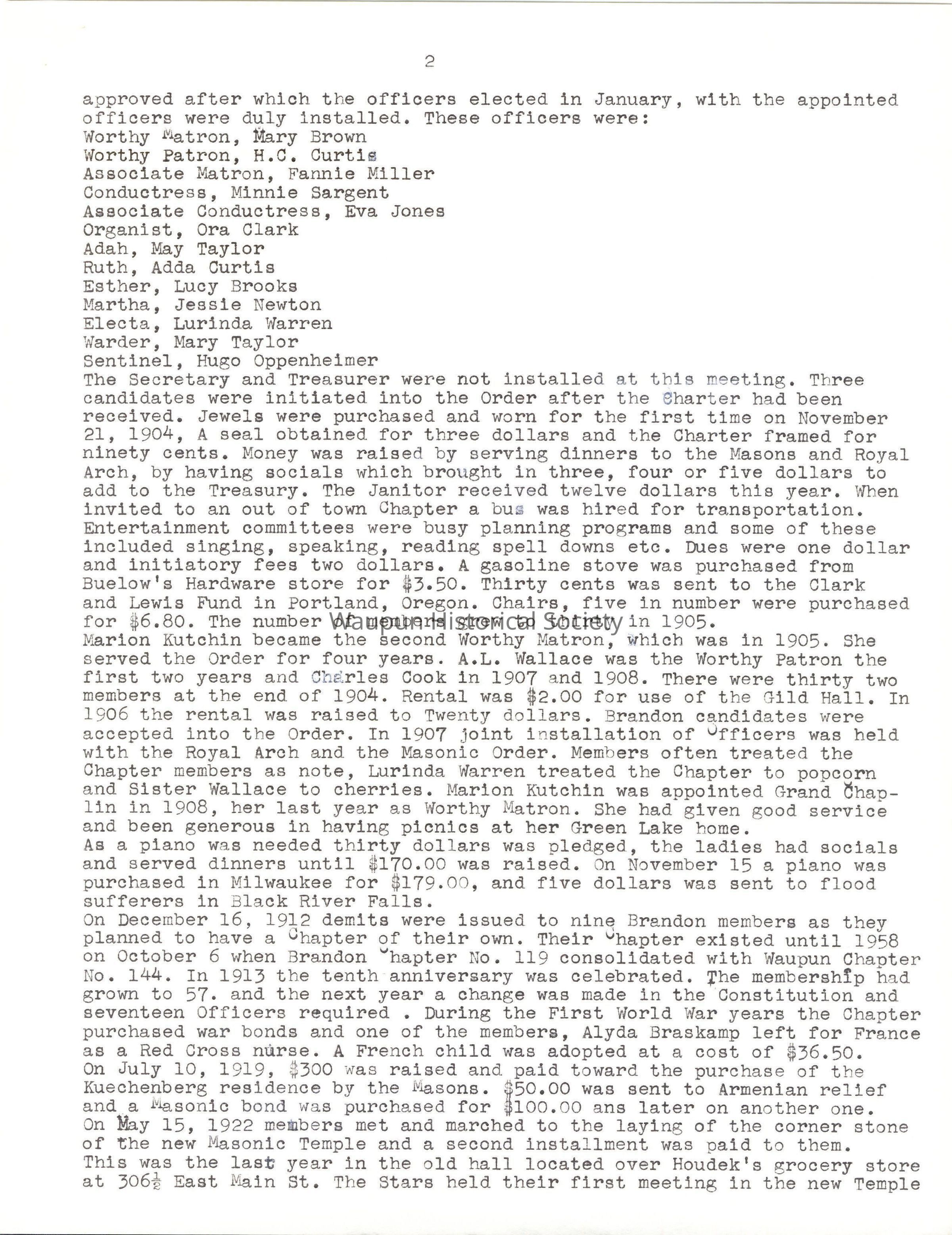 Marion Kutchin became the second Worthy Matron, which was in 1905. She served the Order for four years. A. L. Wallace was the Worthy Patron the first two years and Charles Cook in 1907 and 1908. There were thirty two members at the end of 1904. Rental was $2.00 for use of the Gild Hall. In 1906 the rental was raised to Twenty dollars. Brandon candidates were accepted into the Order. In 1907 point installation of officers was held with the Royal Arch and the Masonic Order. Members often treated the Chapter members as note, Lurinda Warren treated the Chapter to popcorn and Sister Wallace to cherries. Marion Kutchin was appointed Grand Chaplin in 1908, her last year as Worthy Matron. She had given good service and been generous in having picnics at her Green Lake home.