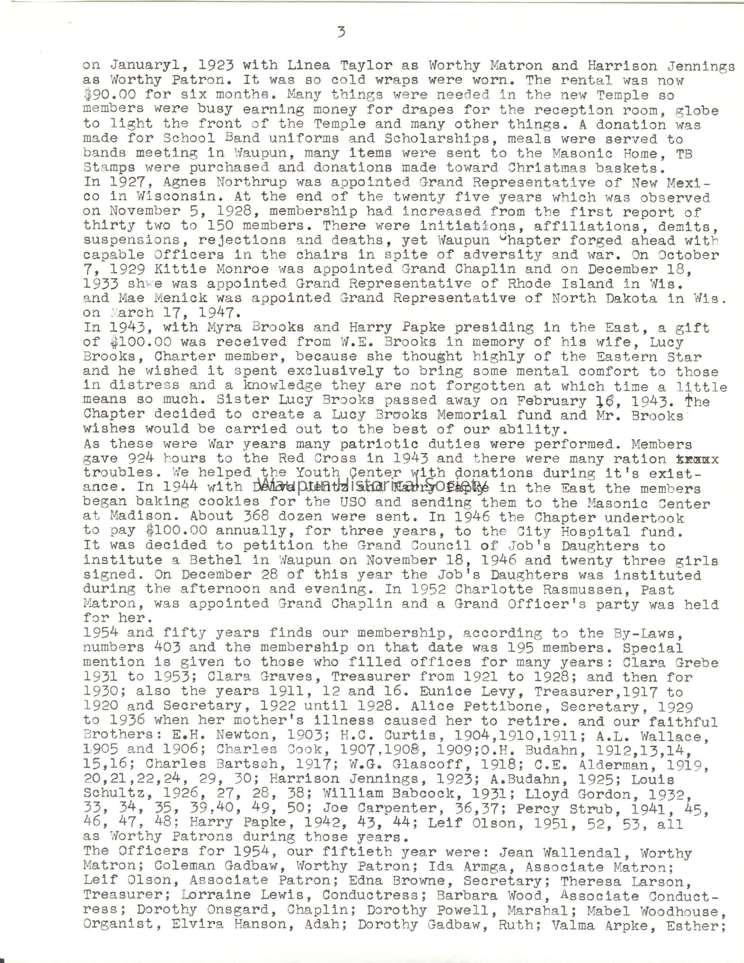 1954 and fifty years finds our membership, according to the By-Laws, numbers 403 and the membership on that date was 195 members. Special mention is given to those who filled offices for many years: Clara Grebe 1931 to 1953; Clara Graves, Treasurer from 1921 to 1928; and then for 1930; also the years 1911, 12 and 16. Eunice Levy, Treasurer, 1917 to 1920 and Secretary, 1922 until 1928. Alice Pettibone, Secretary, 1929 to 1936 when her mother's illness caused her to retire and our faithful Brothers: E. H. Newton, 1903; H. C. Curtis, 1904, 1910, 1911; A. L. Wallace, 1905 and 1906; Charles Cook, 1907, 1908, 1909; O. H. Budahn, 1912, 13, 14, 15, 16; Charles Bartsch, 1917; W. G. Glascoff, 1918; C. E. Alderman, 1919, 20, 21, 22, 24, 29, 30; Harrison Jennings, 1923; A. Budahn, 1925; Louis Schultz, 1926, 27, 28, 38; William Babcock, 1931; Lloyd Gordon, 1932, 33, 34, 35, 39, 40, 49, 50; Joe Carpenter, 36, 37; Percy Strub, 1941, 45, 46, 47, 48; Harry Papke, 1942, 43, 44; Leif Olson, 1951, 52, 53, all as Worthy Patrons during those years.