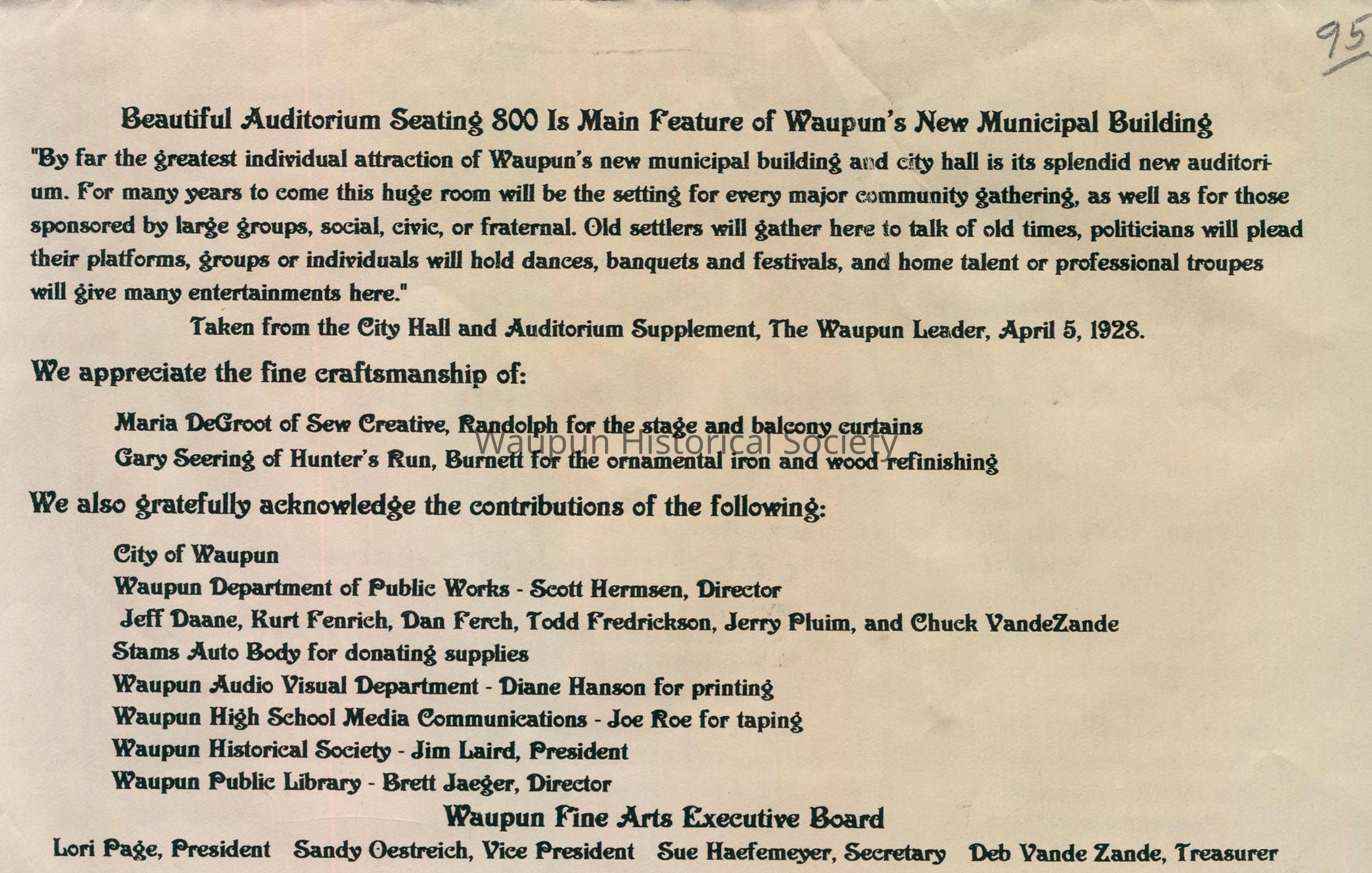 Taken from the City Hall and Auditorium Supplement, The Waupun Leader, April 5, 1928.