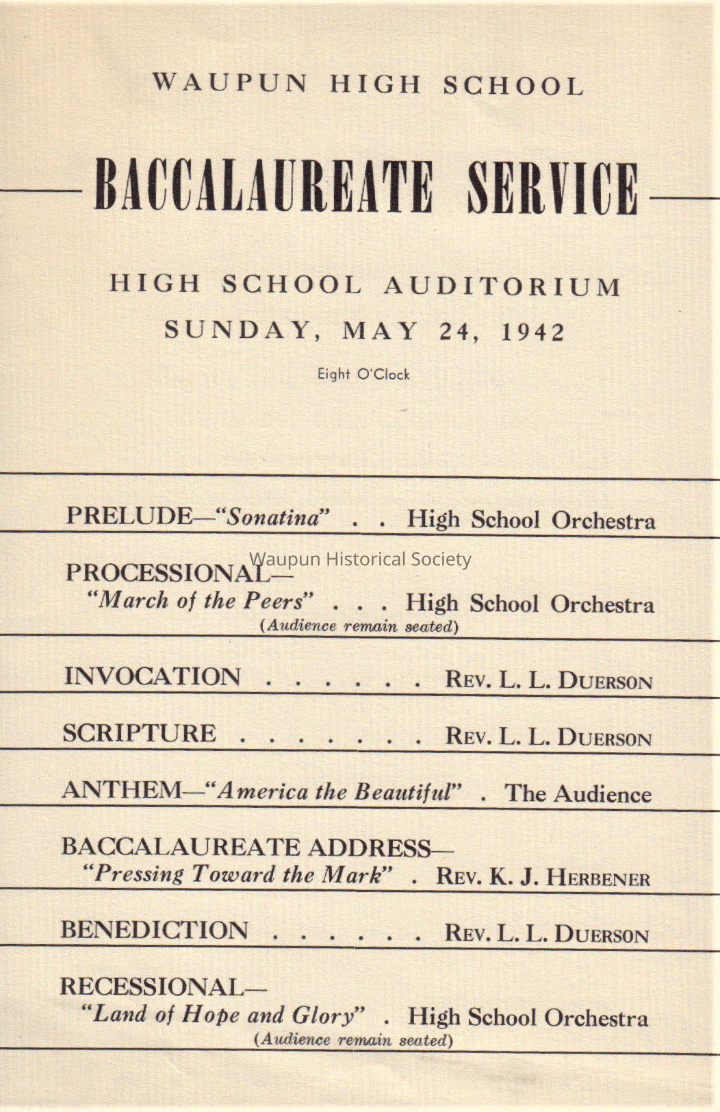 Waupun High School (Baccalaureate-Service) May-24-1942Acquisition