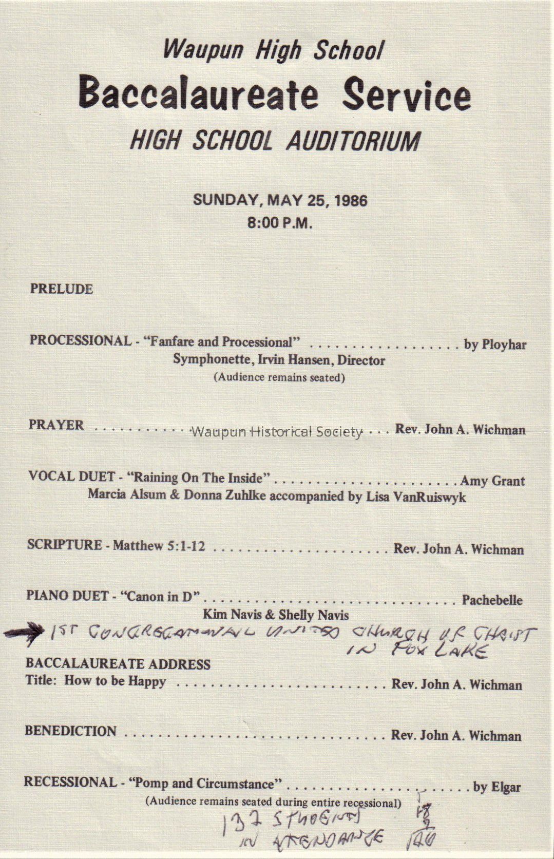 Waupun High School "Baccalaureate Service" (May 25 1986)Acquisition