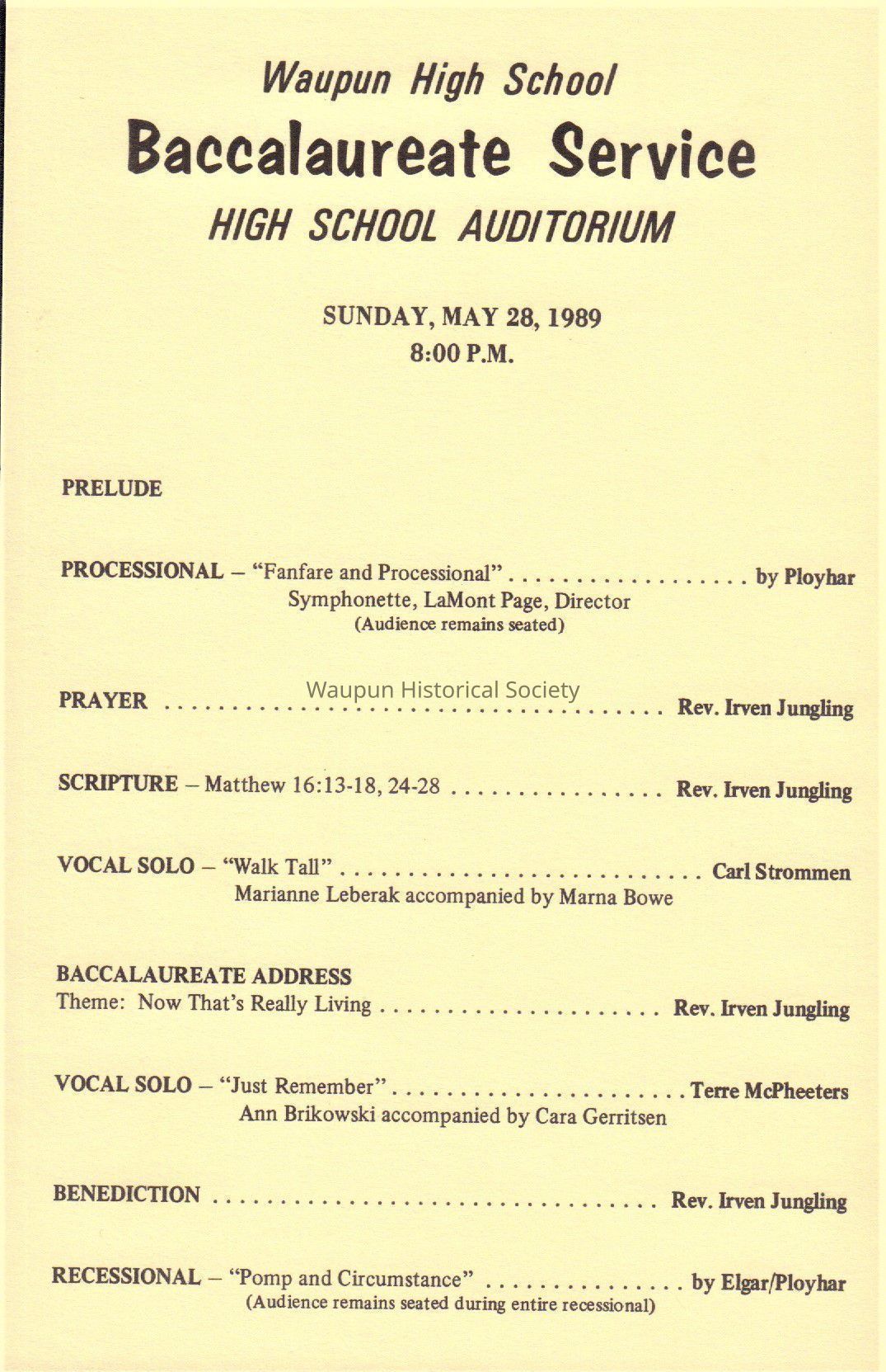 Waupun High School "Baccalaureate Service" (May 28 1989)Acquisition