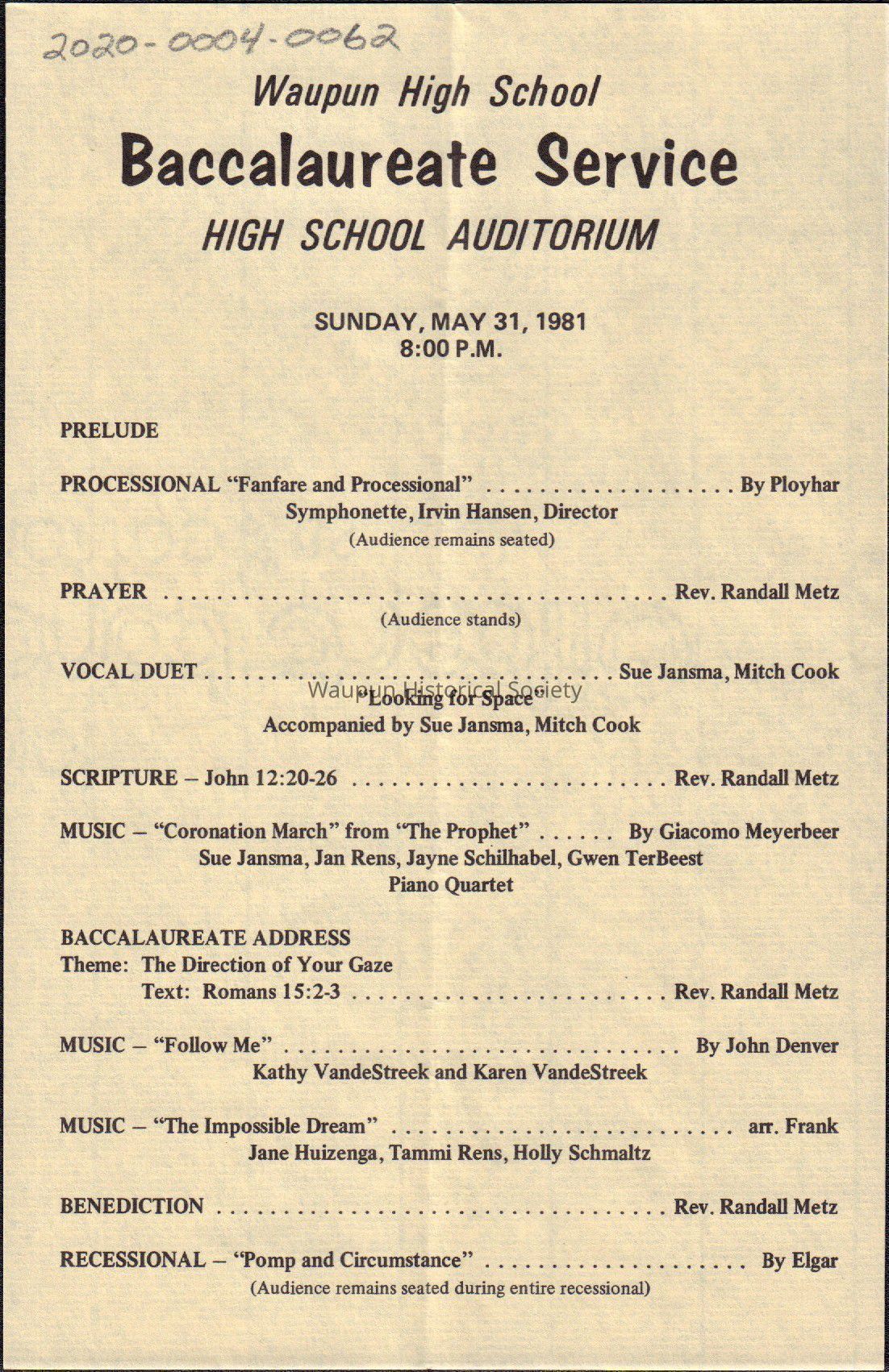 Waupun High School "Baccalaureate Service" (May 31 1981)Acquisition