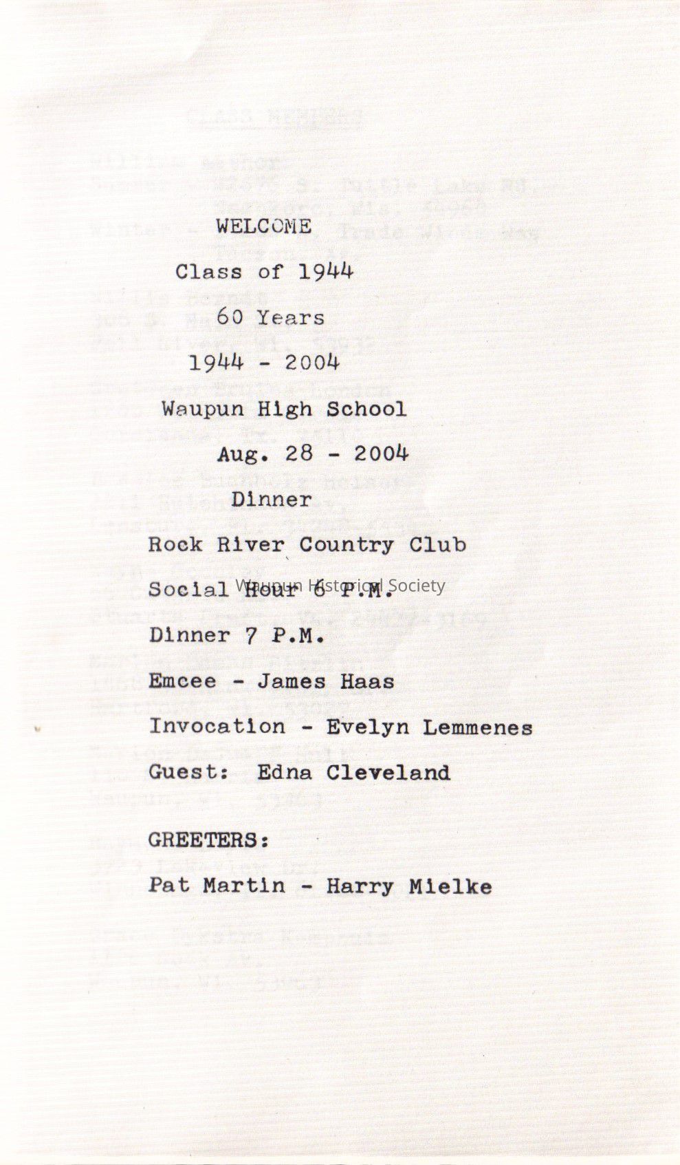 Waupun High School Class of 1944 (1944-2004) 60yrsAcquisition
