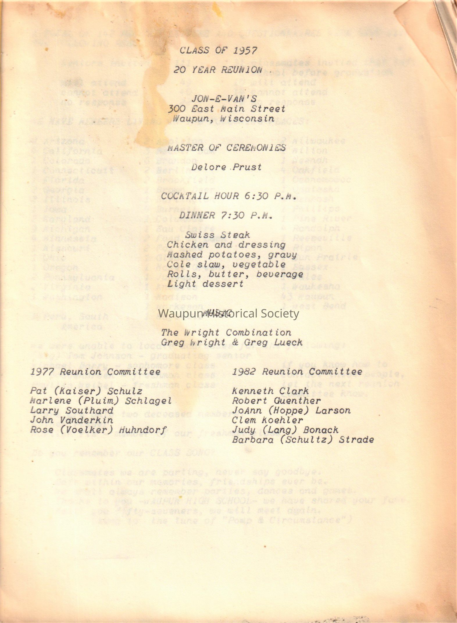 Waupun High School "Class of 1957' 20 yr Reunion (1977)Entry/Object ID
