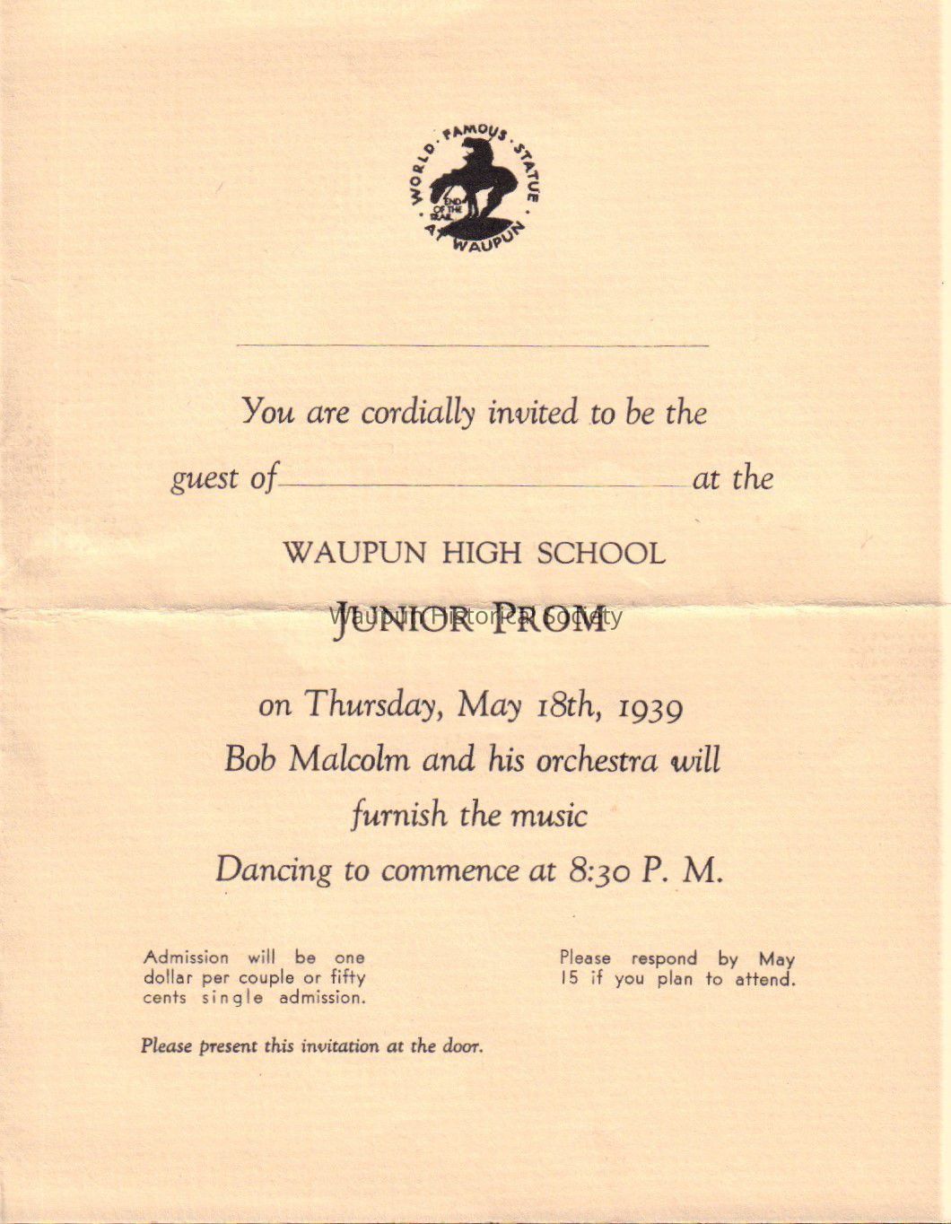 Waupun High School "invitation to Junior Prom" May 18 1939Acquisition