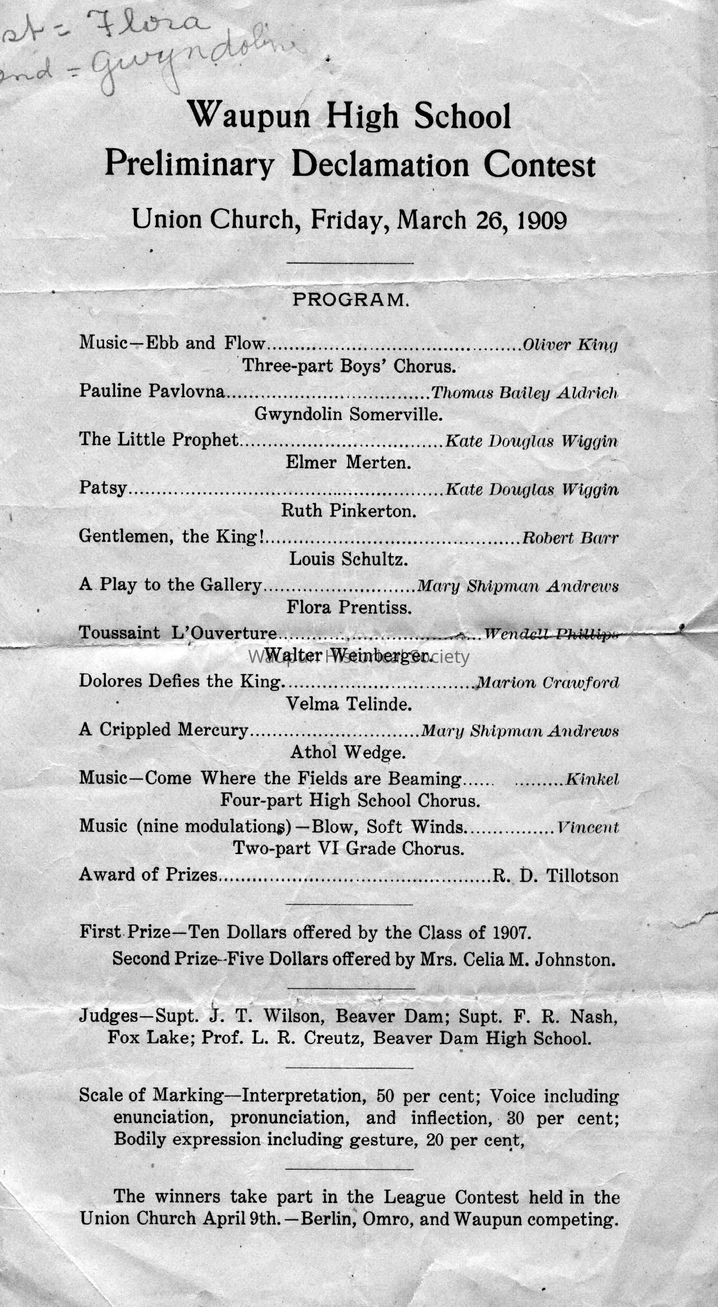 Program from the "Waupun High School Preliminary Declamation Contest" held at the Union Church, Friday, March 26, 1909.