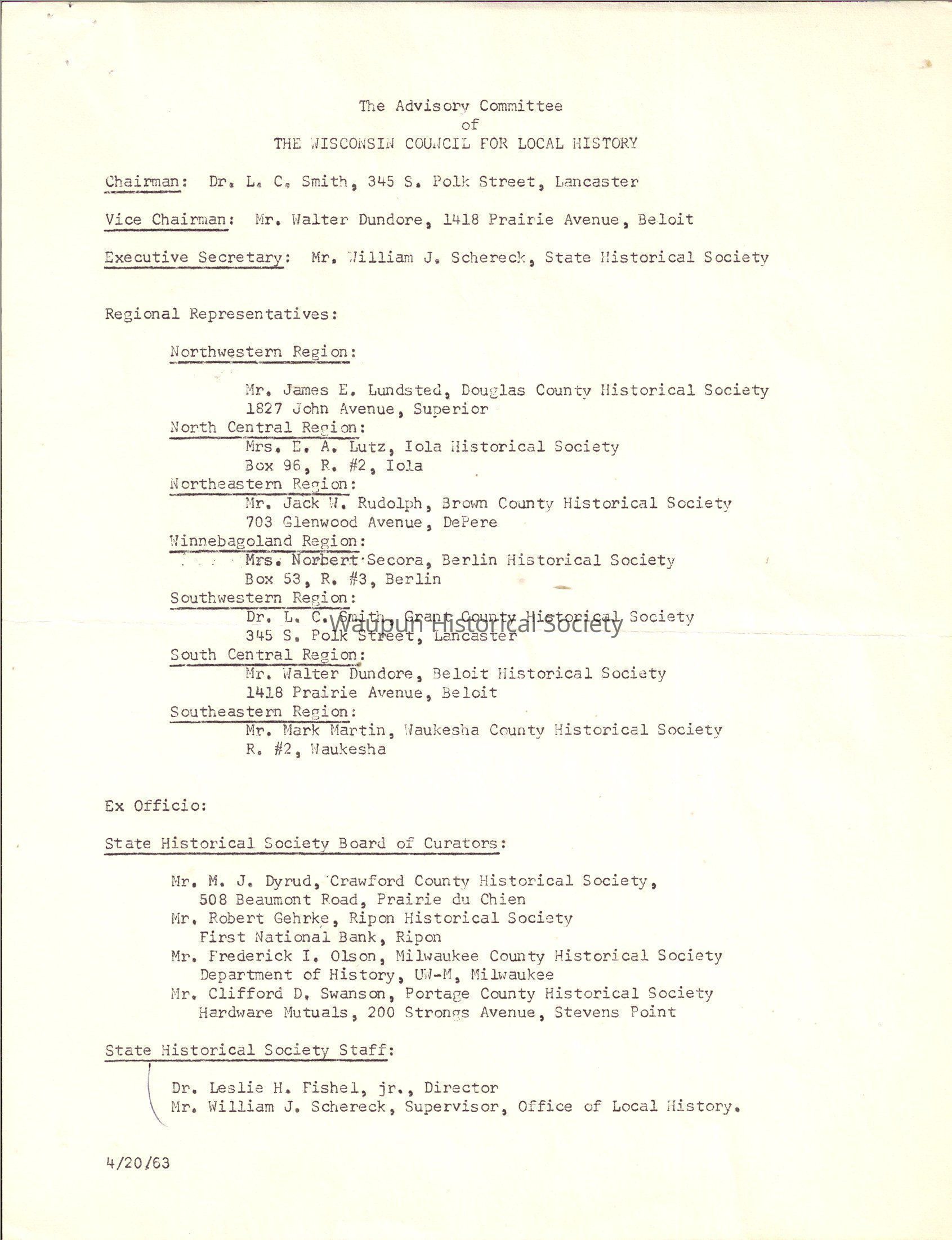 A Document is about as a representative of Wisconsin council for local history from this region. The one think i like to especially bring to your attention is the new opportunity that we can make recommendations for the programs of the annual institutes for local History .Acquisition