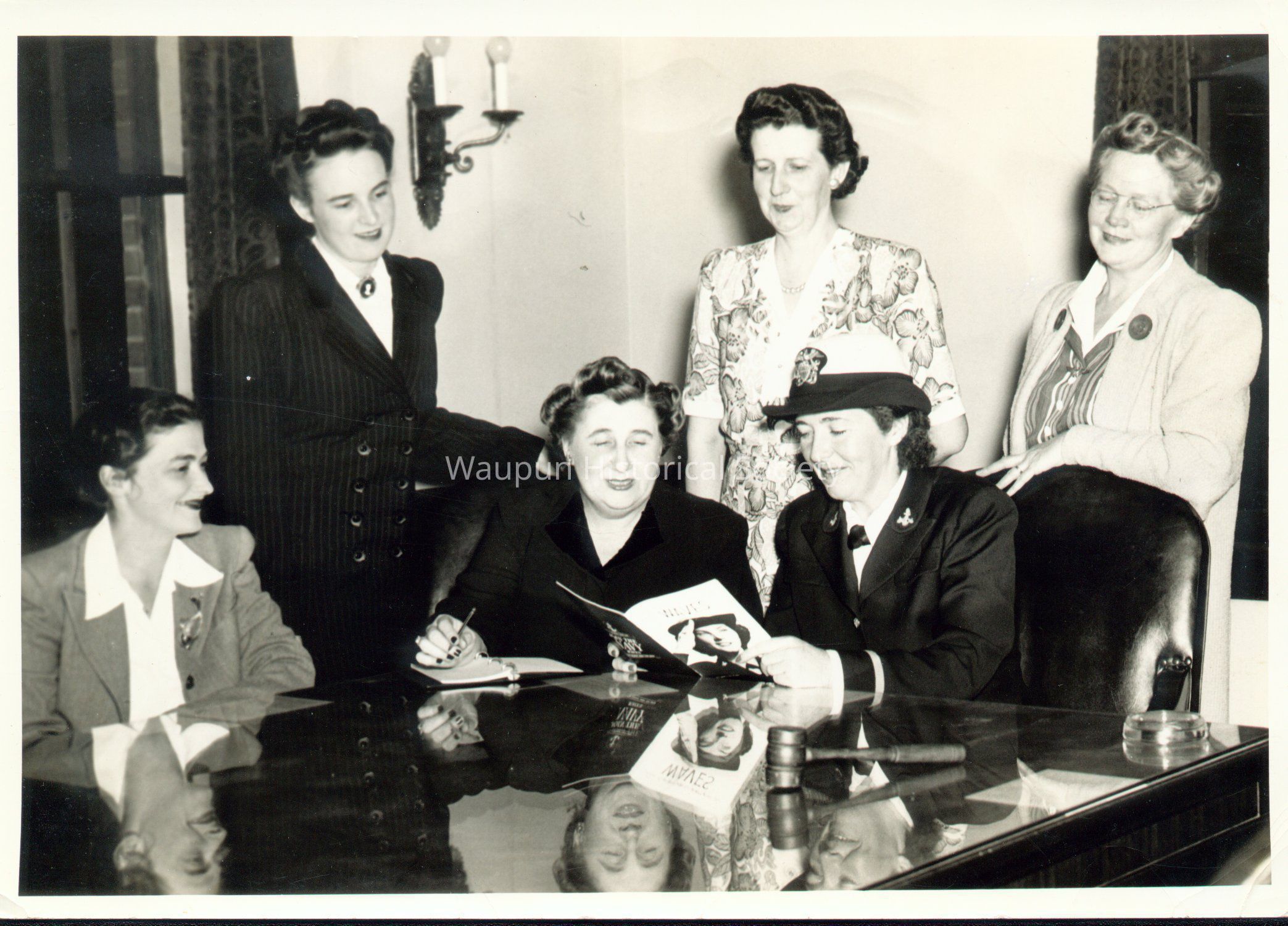 Waupun Ladies during WWII. Caption on the back indicates: Sue McBride AKA Mrs. George SR., Helen Murray, Gladys Swartz AKA Mrs. K. A. Swartz, Bernice Grenzow AKA Mrs. William Grenzow, Mary Meagher (AKA Mrs. T F Meagher) talking to WAVE who spoke in Waupun. Picture appeared in the Waupun Leader News during WWII. The drapes and the light on the wall indicate that the picture was taken at the City Hall.