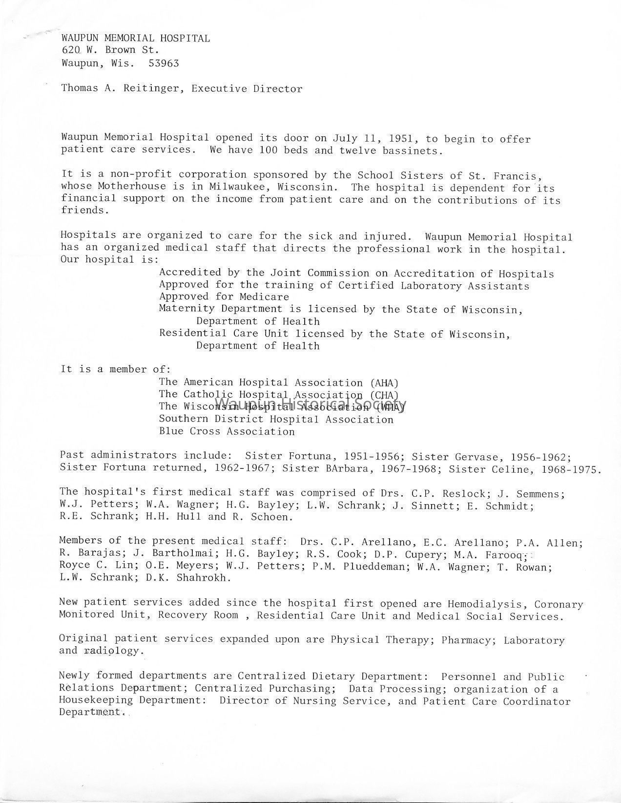 Historical information on Waupun Memorial Hospital for 1976 Bicentennial Celebration in Waupun, WI.