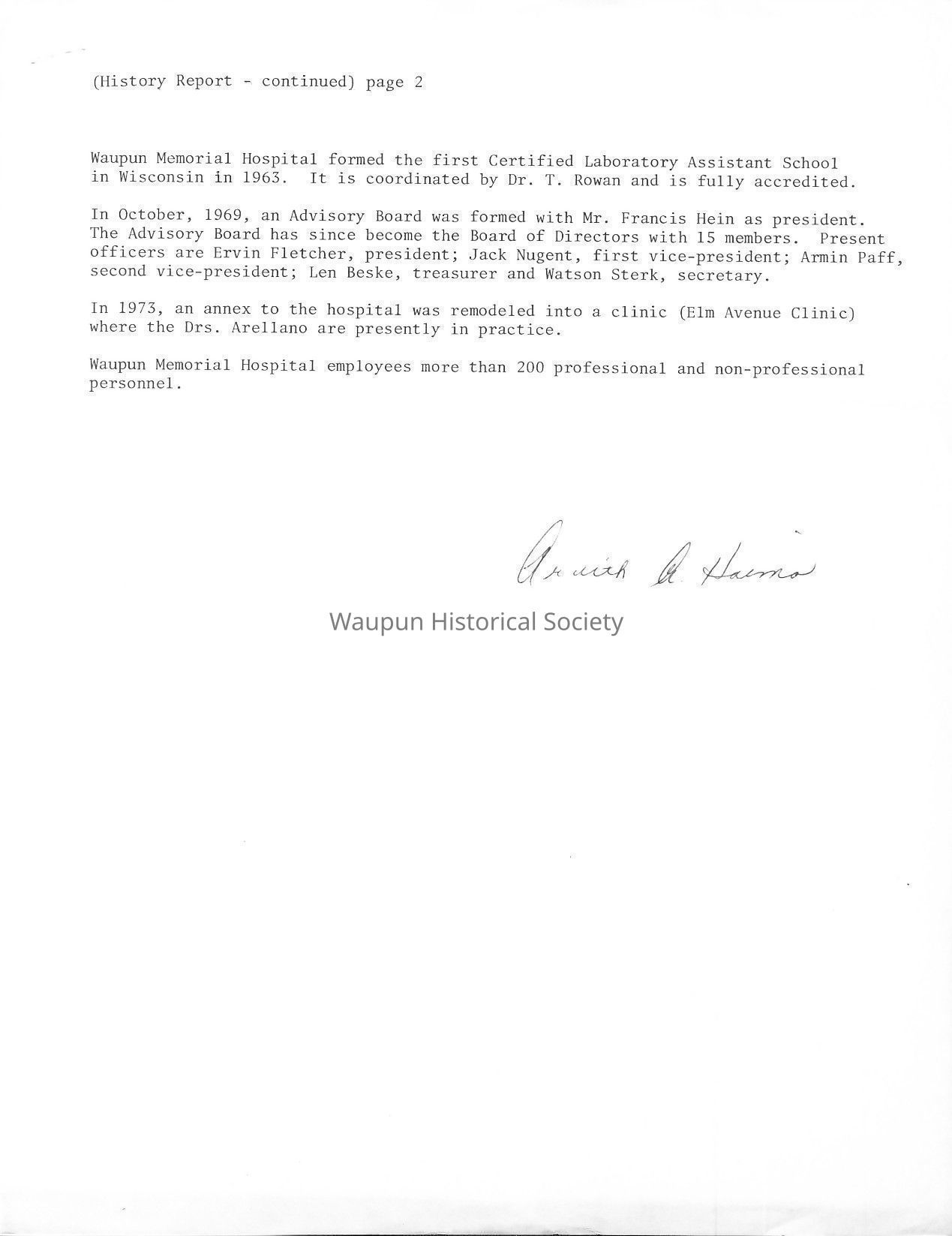 Waupun Memorial Hospital formed the first Certified Laboratory Assistant School in Wisconsin in 1963. It is coordinated by Dr. T. Rowan and is fully accredited.