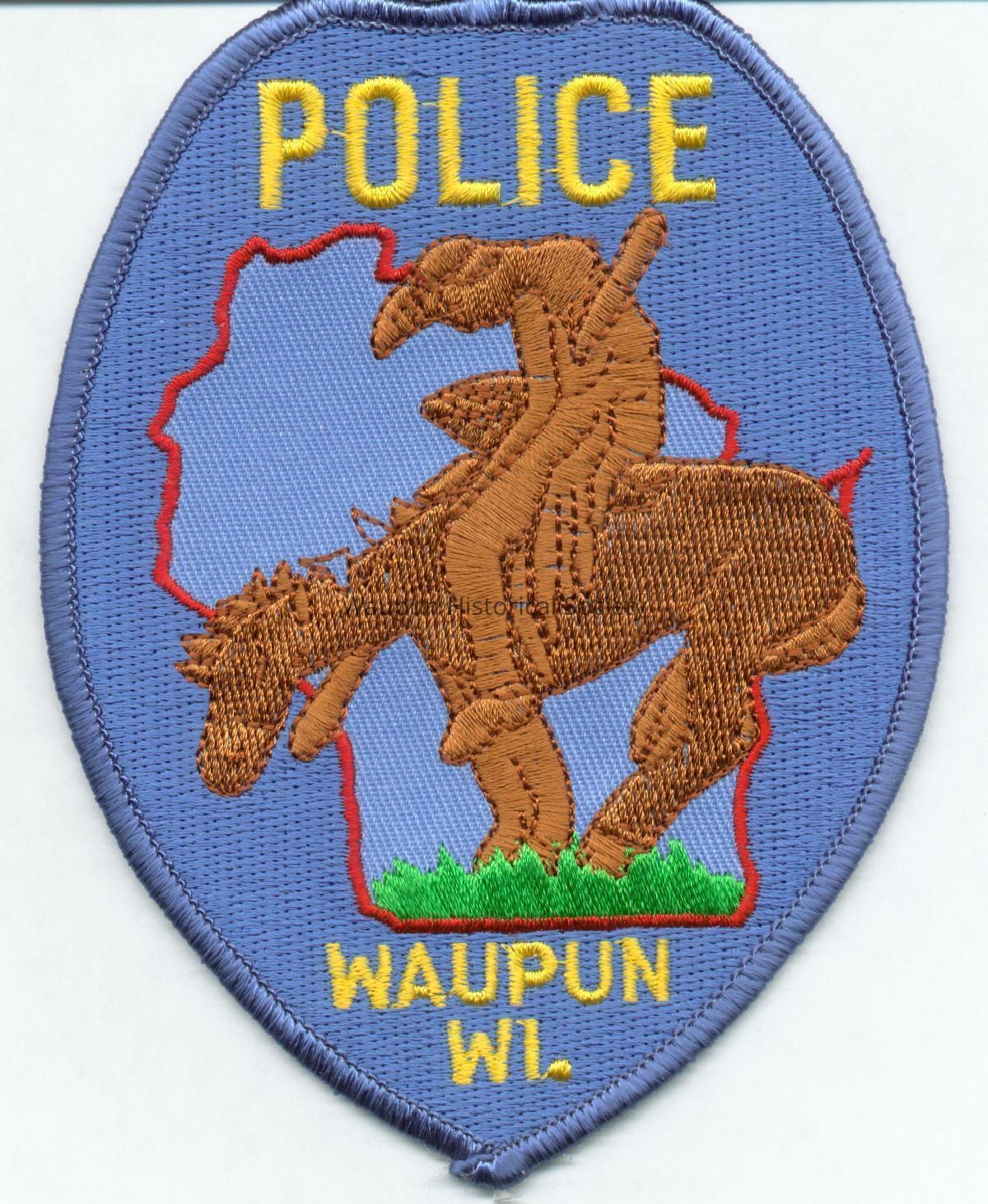 Police Patch showing the "End of the Trail" and the words "POLICE, WAUPUN, WI." It is 4 1/2" high by 3 1/2" wide.Acquisition