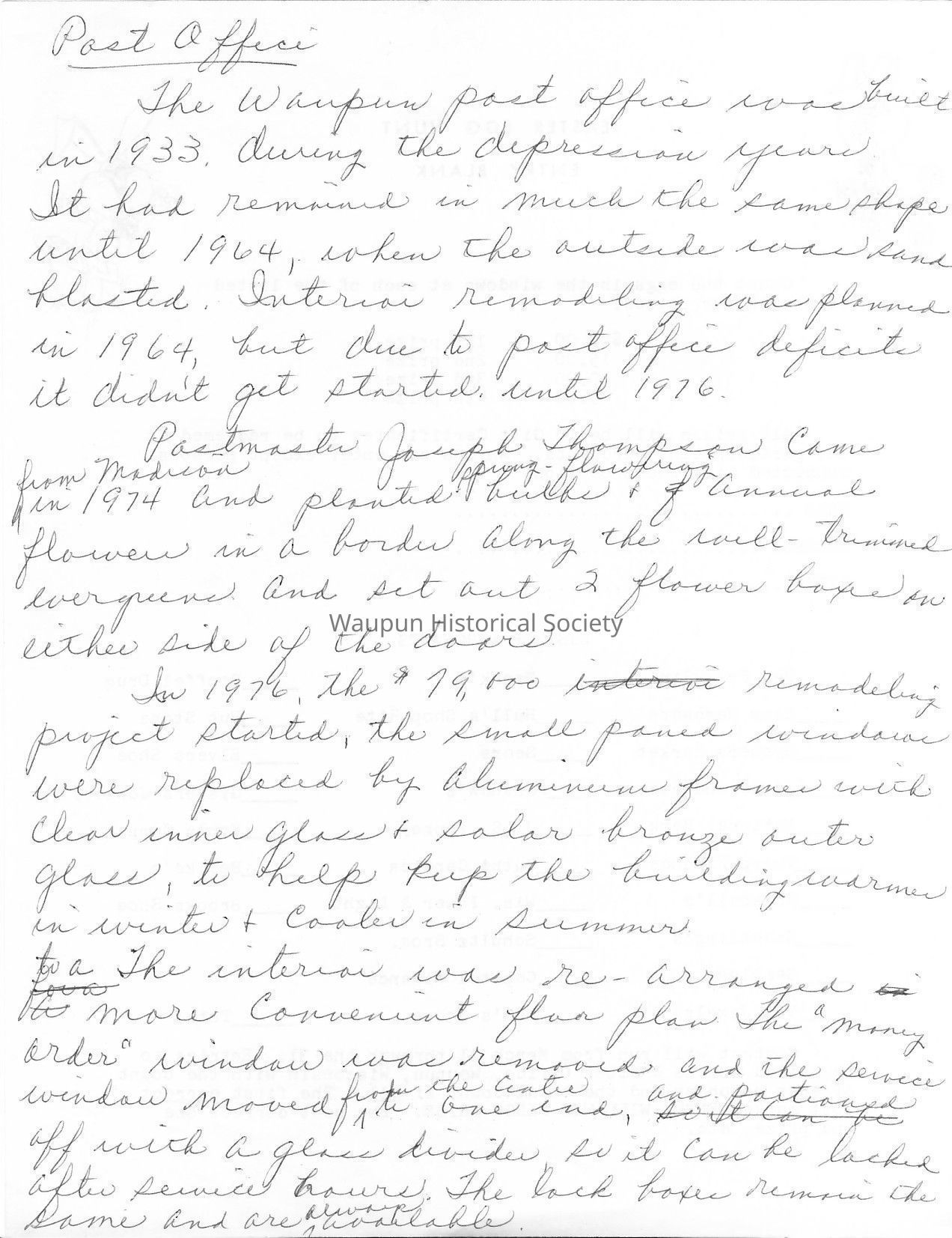 The Waupun Post Office was built in 1933 during the depression year. It had remained in much the same shape until 1964, when the outside was sand blasted. Interior remodeling was planned in 1964, but due to post office deficits it didn't get started until 1976.