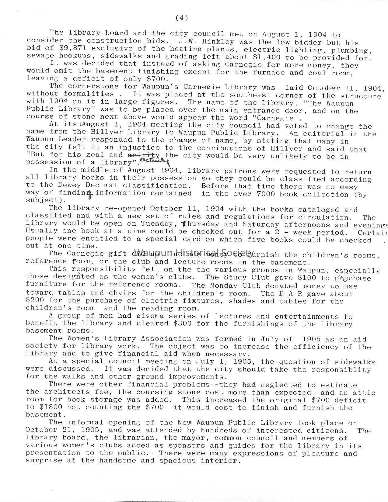 The library board and the city council met on August 1, 1904 to consider the construction bids. J.W. Hinkley was the low bidder but his bid of $9,871 exclusive of the heating plants, electric lighting, plumbing, sewage hookups, sidewalks and grading left about $1,400 to be provided for.