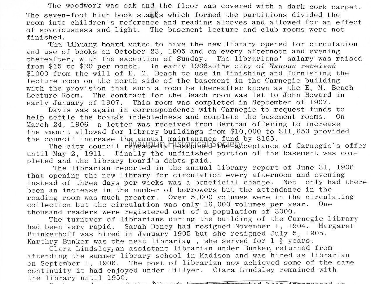 The Library board voted to have the new library opened for circulation and use of books on October 23, 1905 and on every afternoon and evening thereafter, with the exception of Sunday. The librarians' salary was raised from $15 to $20 per month. In early 1906, the city of Waupun received $1000 from the will of E. M. Beach to use in finishing and furnishing the lecture room on the north side of the basement in the Carnegie building with the provision that such a room be thereafter known as the E. M. Beach Lecture Room. The contract for the Beach room was let to John Howard in early January of 1907. This room was completed in September of 1907.