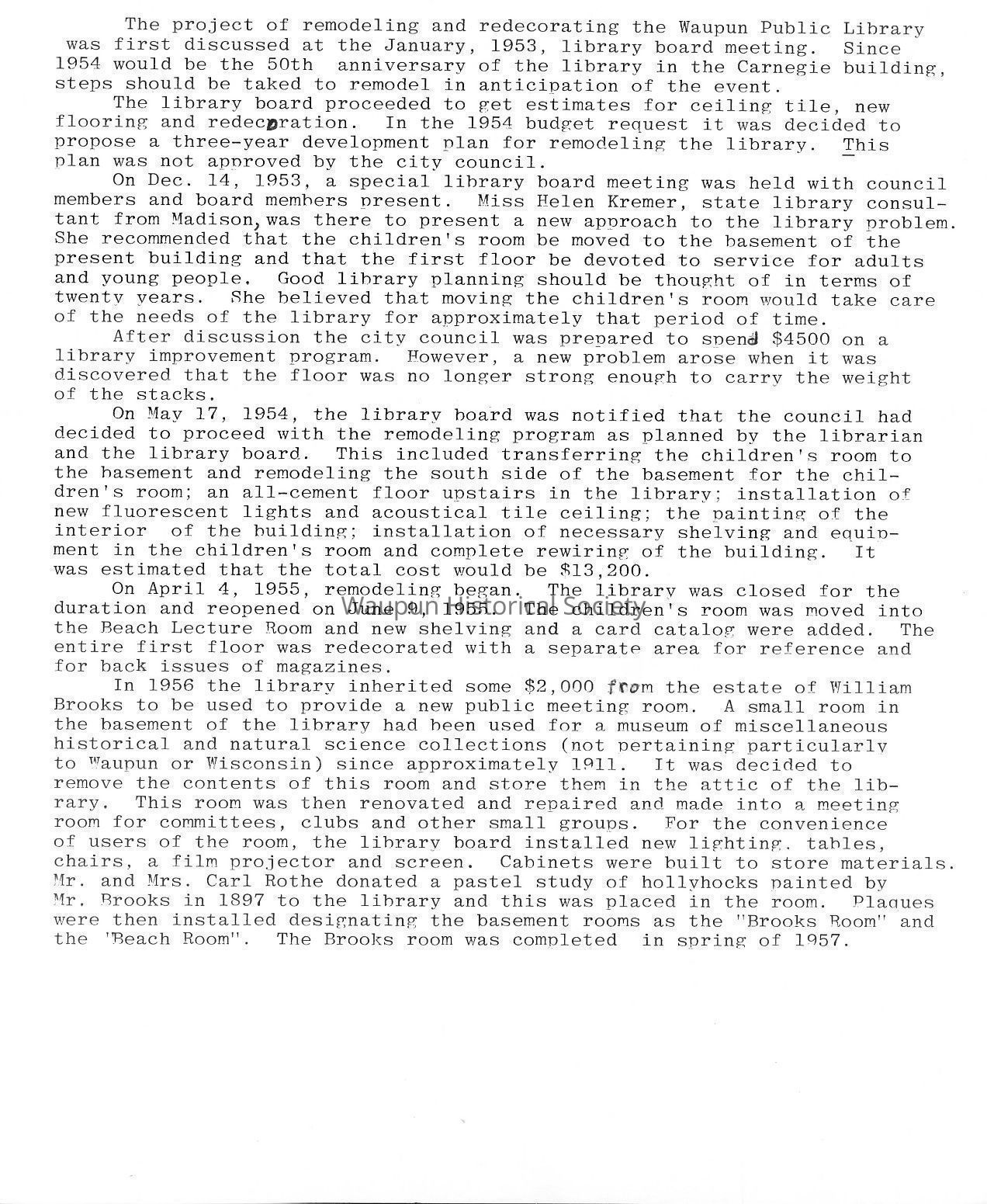 In 1956 the library inherited some $2,000 from the estate of William Brooks to be used to provide a new public meeting room. A small room in the basement of the library had been used for a museum of miscellaneous historical and natural science collections (not pertaining particularly to Waupun or Wisconsin) since approximately 1911. It was decided to remove the contents of this room and store them in the attic of the library. This room was then renovated and repaired and made into a meeting room for committees, clubs and other small groups. For the convenience of users of the room, the library hoard installed new lighting, tables, chairs, a film projector and screen. Cabinets were built to store materials. Mr. and Mrs. Carl Rothe donated a pastel study of hollyhocks painted by Mr. Brooks in 1897 to the library and this was placed in the room. Plaques were then installed designating the basement rooms as the "Brooks Room" and the 'Beach Room". The Brooks room was completed in spring of 1957.