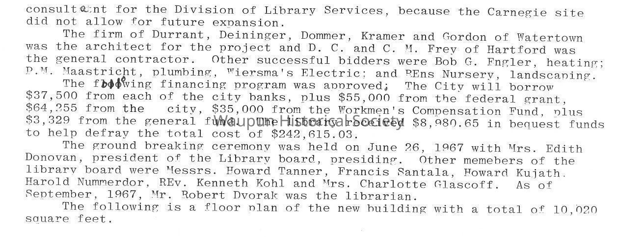 The ground breaking ceremony was held on June 26, 1967 with Mrs. Edith Donovan, president of the Library board, presiding. Other memebers of the library board were Messrs. Howard Tanner, Francis Santala, Howard Kulath. Harold Nummerdor, Rev. Kenneth Kohl and Mrs. Charlotte Glascoff. As of September, 1967, Mr. Robert Dvorak was the librarian.