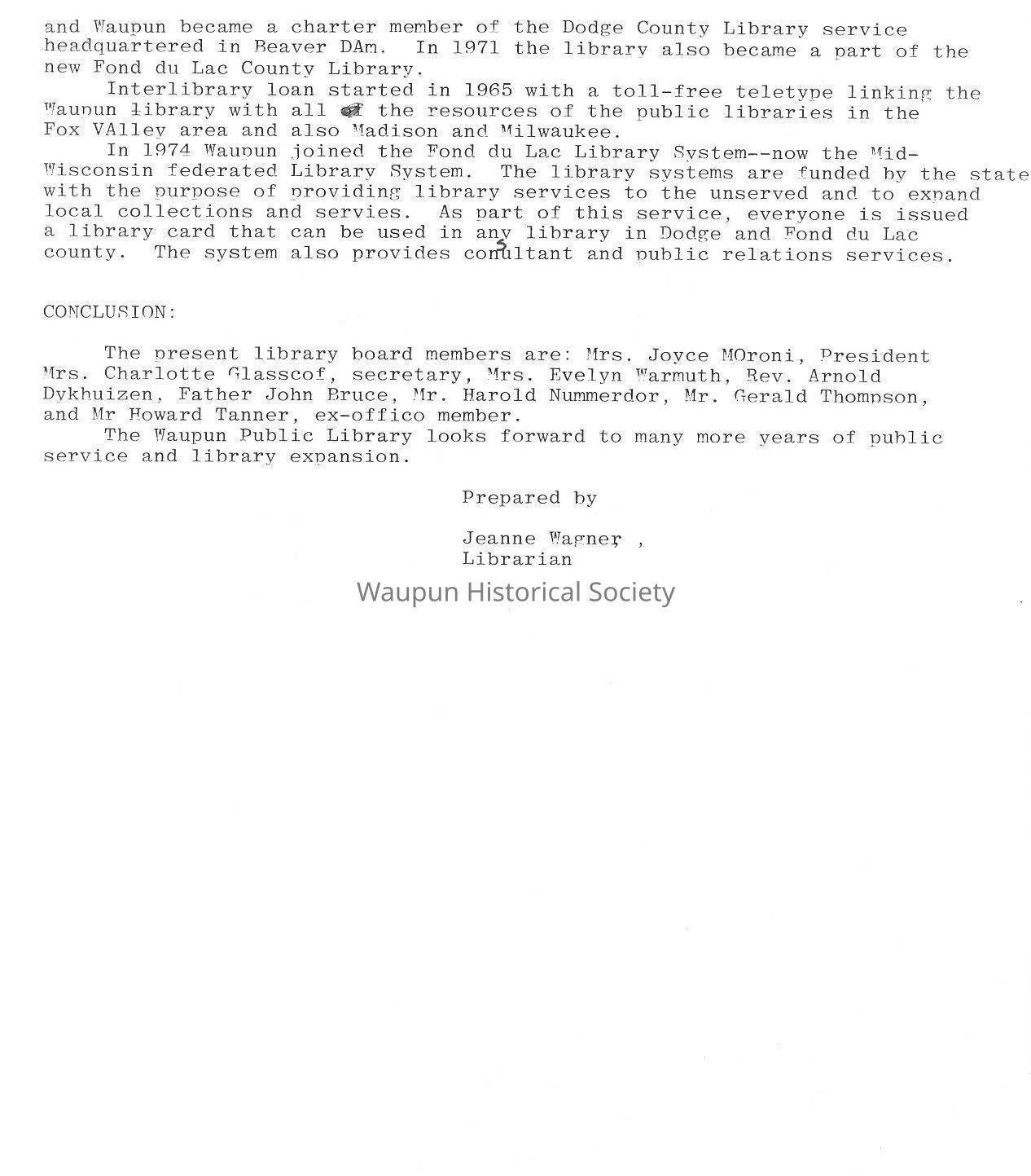 The present library board members are: Mrs. Joyce Moroni, President Mrs. Charlotte Glasscof, secretary, Mrs. Evelyn Warmuth, Rev. Arnold Dykhuizen, Father John Bruce, Mr. Harold Nummerdor, Mr. Gerald Thompson, and Mr Howard Tanner, ex-offico member.