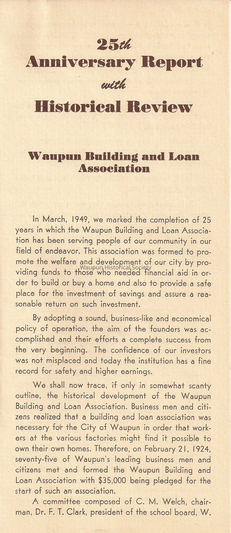 In March, 1949, we marked the completion of 25 years in which the Waupun Building and Loan Association has been serving people of our community in our field of endeavor. This association was formed to promote the welfare and development of our city by providing funds to those who needed financial aid in order to build or buy a home and also to provide a safe place for the investment of savings and assure a reasonable return on such investment.