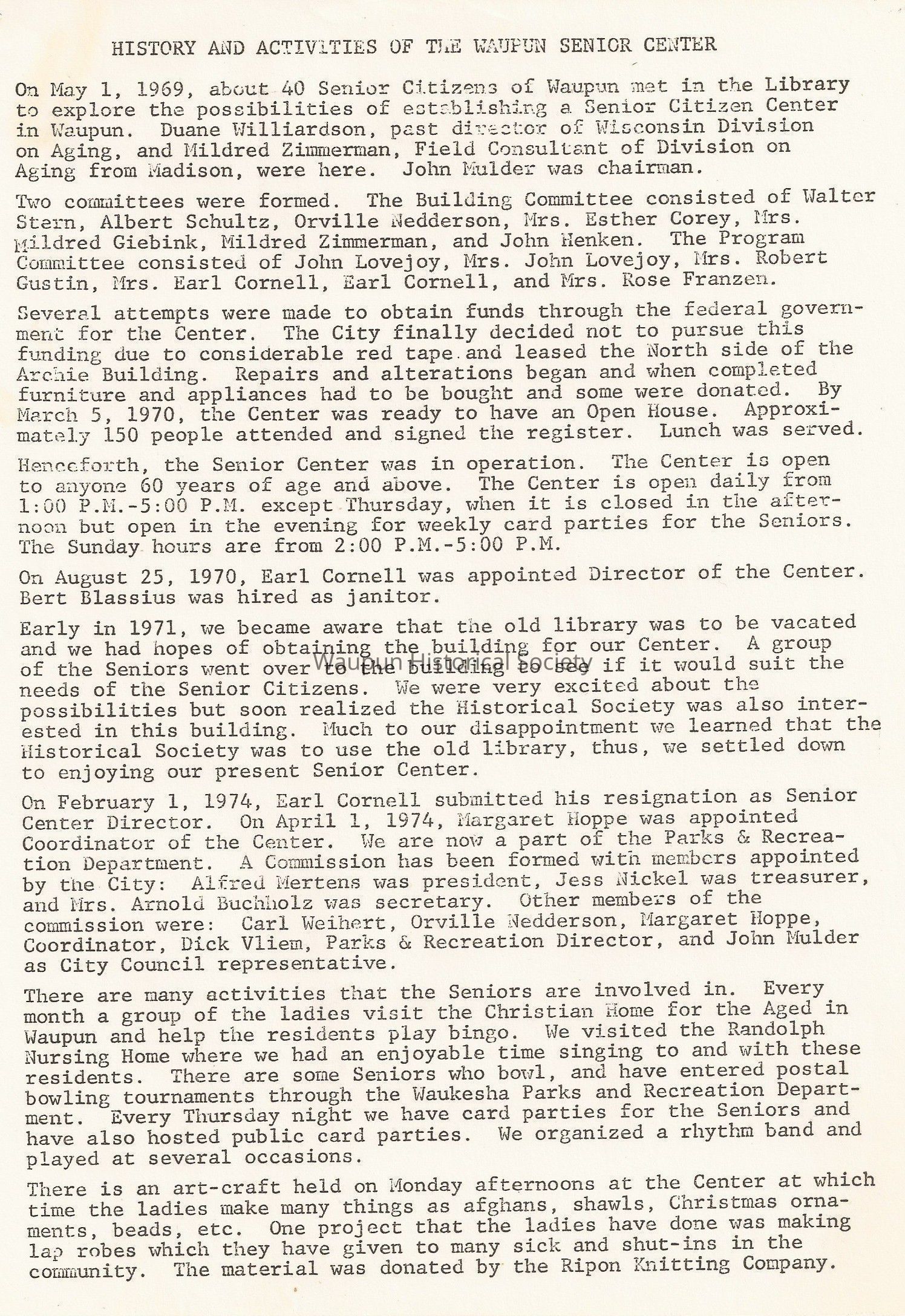 On February 1, 1974, Earl Cornell submitted his resignation as Senior Center Director. On April 1, 1974, Margaret Hoppe was appointed Coordinator of the Center. We are now a part of the Parks & Recreation Department. A Commission has been formed with members appointed by the City: Alfred Mertens was president, Jess Nickel was treasurer, and Mrs. Arnold Buchholz was secretary. Other members of the commission were: Carl Weihert, Orville Nedderson, Margaret Hoppe, Coordinator, Dick Vliem, Parks & Recreation. Director, and John Mulder as City Council representative.