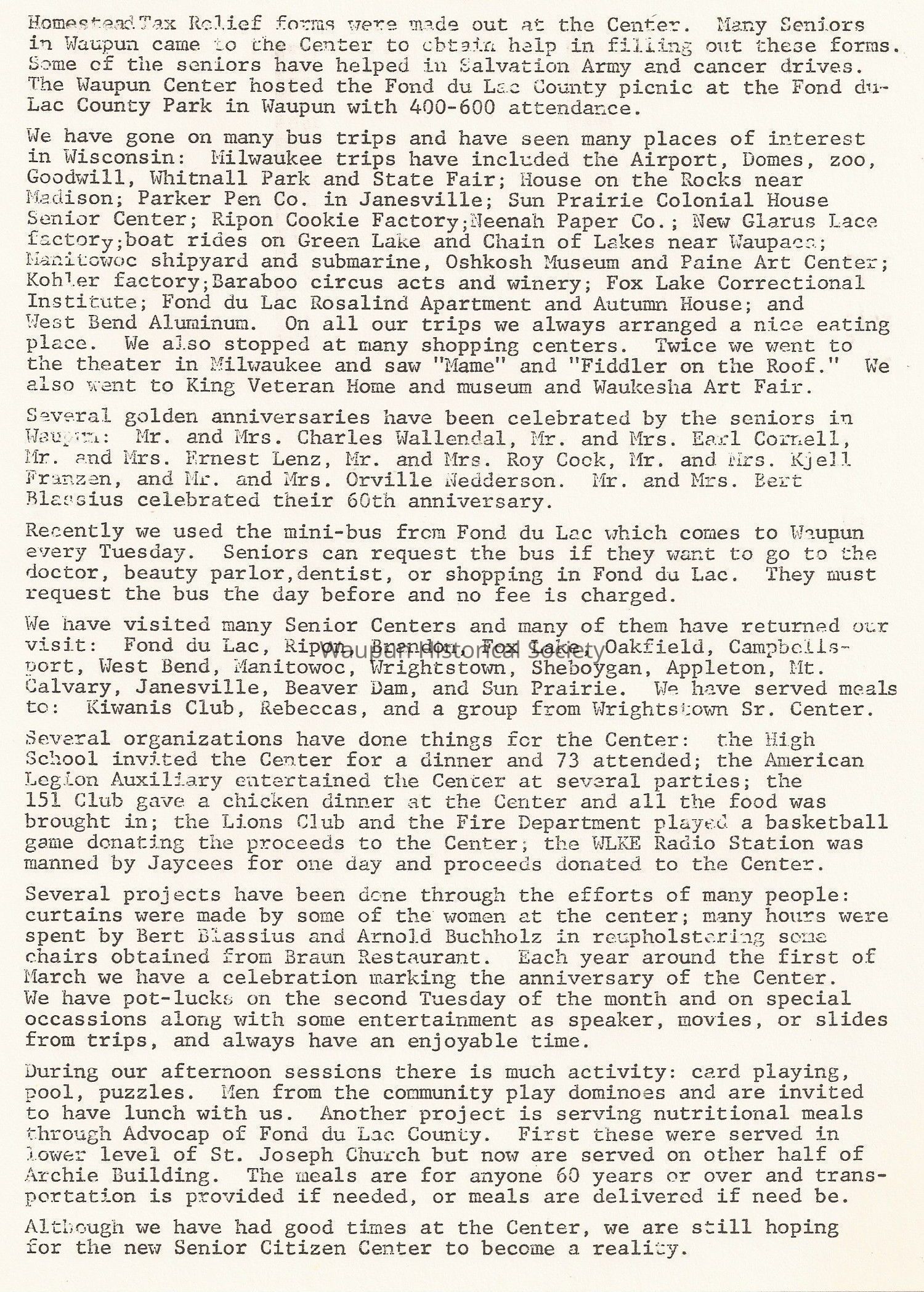 Homestead Tax Relief forms were made out at the Center. Many Seniors in Waupun came to the Center to obtain help in filling out these forms. Some cf the seniors have helped in Salvation Army and cancer drives. The Waupun Center hosted the Fond du Lac County picnic at the Fond du Lac County Park in Waupun with 400-600 attendance.