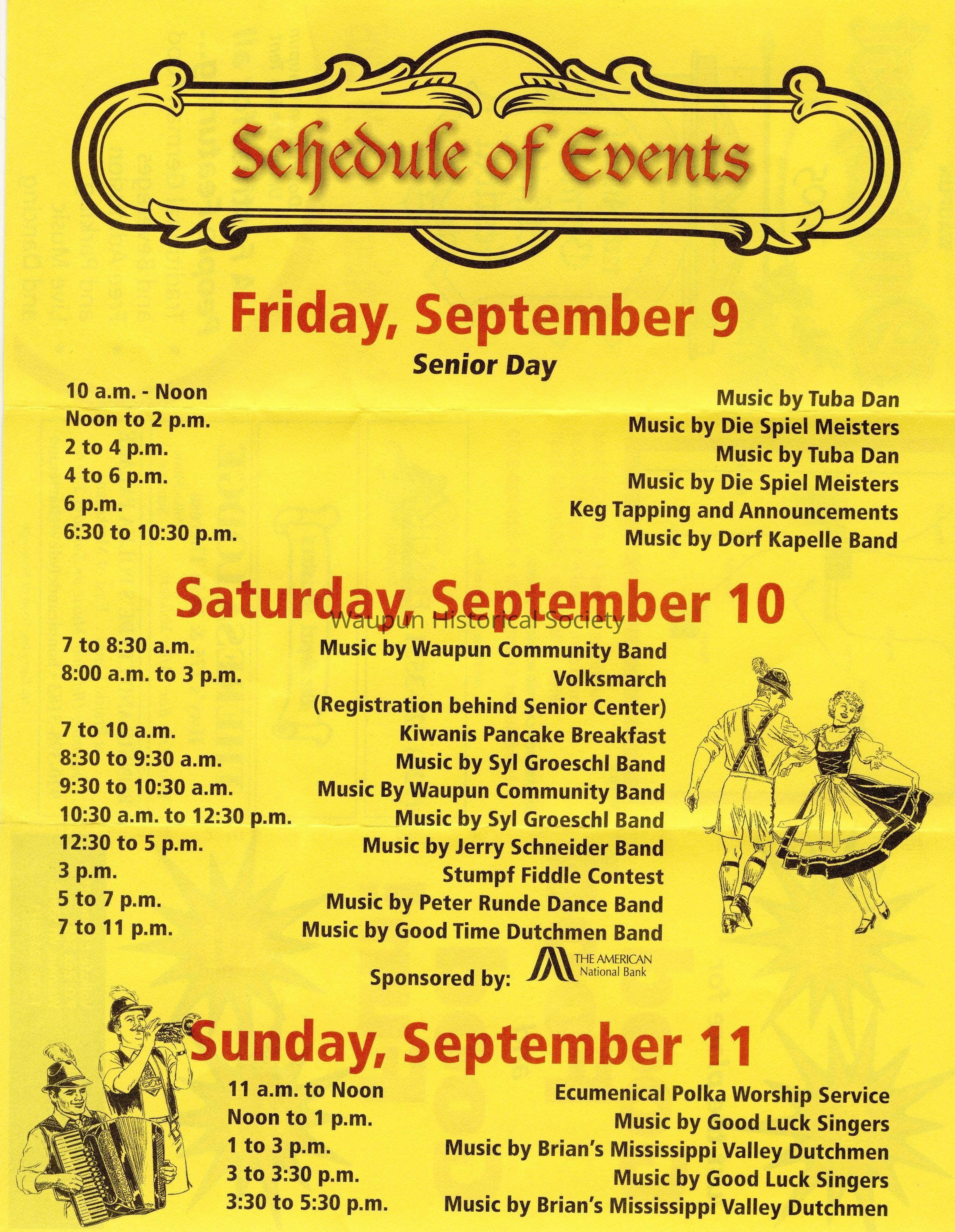 Waupun Volksfest 2005 Flyer. September 9, 10 & 11, 2005. A Festival for all people featuring...Traditional German Food and Beverages, Free Admission and Parking, Live Music and Dancing. Includes schedule of events.