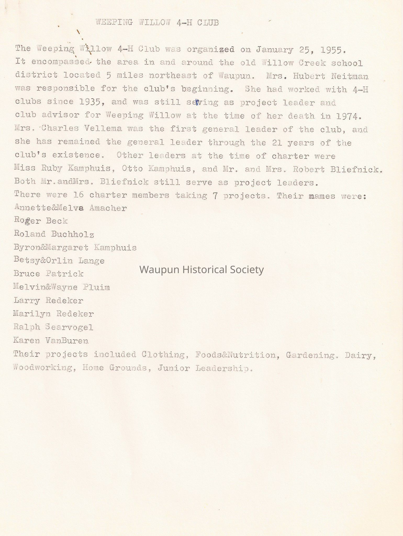 The Weeping Willow 4-H Club was organized on January 25, 1955. It encompassed the area in and around the old Wil1ow Creek school district located 5 miles northeast of Waupun. Mrs. Hubert Neitman was responsible for the club's begining. She had worked with 4-H clubs since 1935, and was still serving as project leader and club advisor for Weeping Willow at the time of her death. in 1974. Mrs. Charles Vellema was the first general leader of the club, and she has remained the general leader through the 21 years of the club's existence. Other leaders at the time of charter were Miss Ruby Kamphuis, Otto Kamphuis, and Mr. and Mrs. Robert Bliefnick. Both Mr. and Mrs. Bliefnick still serve as project leaders.