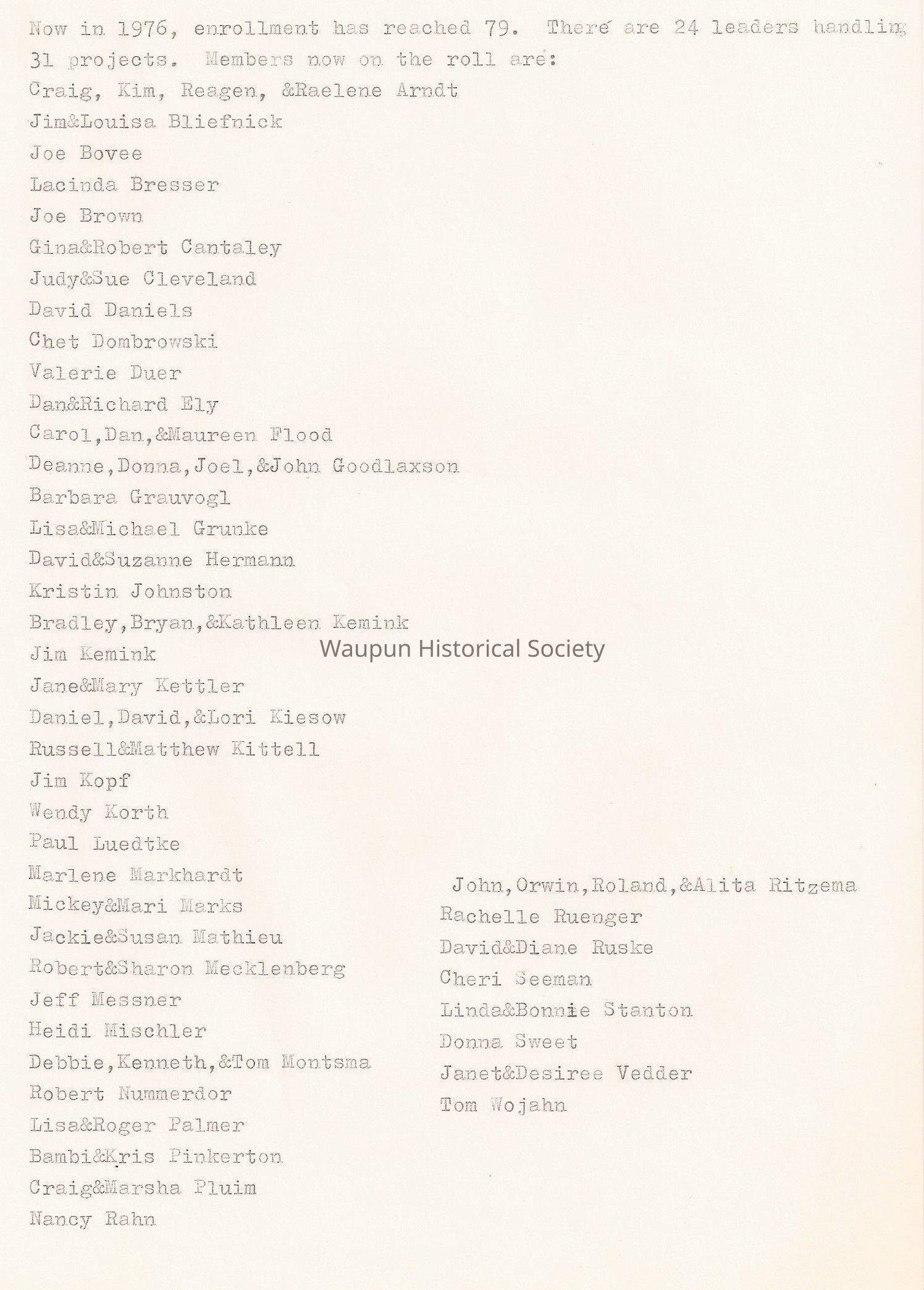 Now in 1976, enrollment has reached 79. There are 24 leaders handing 31 projects. Members now on the roll are: