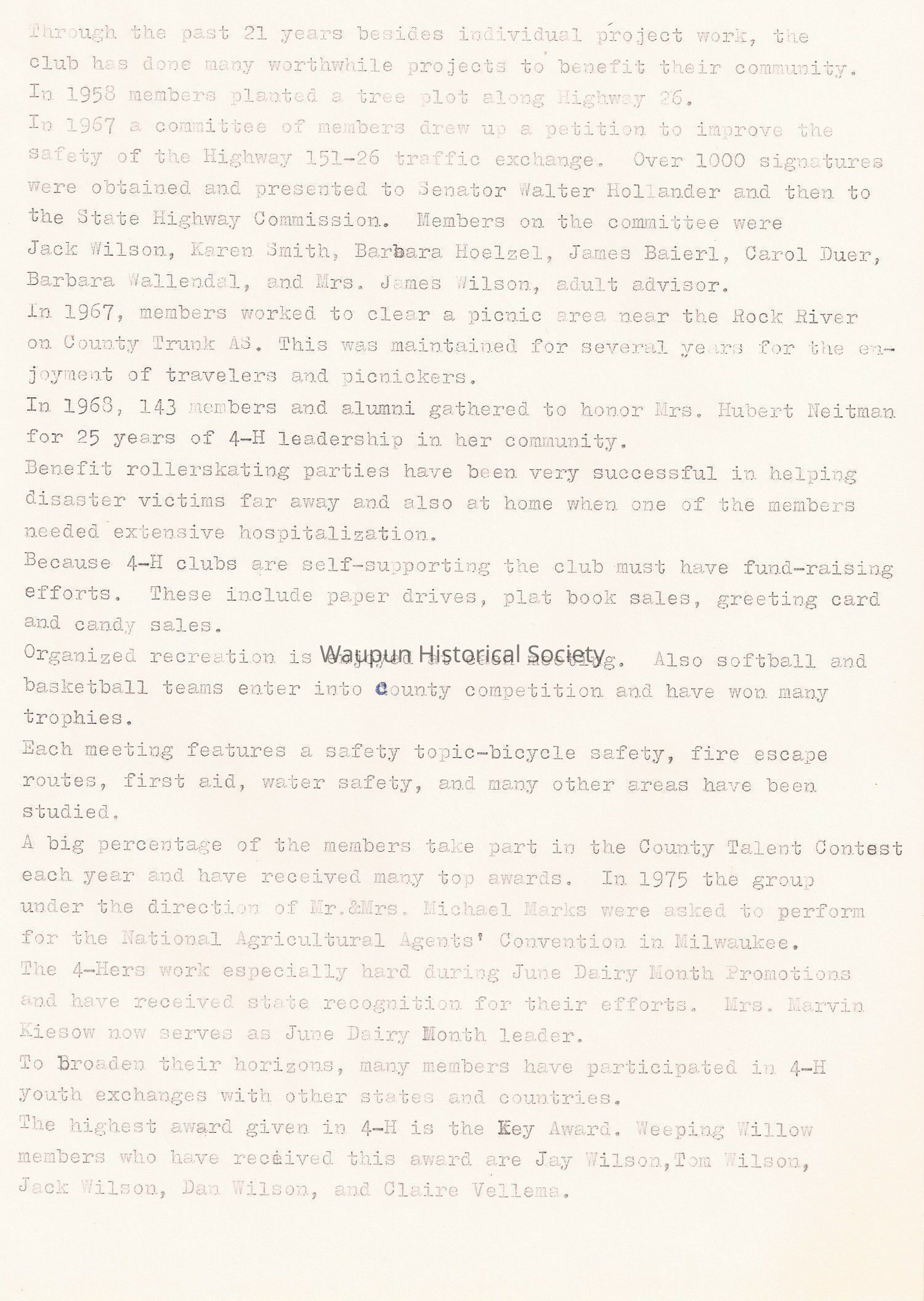 In 1967 a committee of members drew up a petition to improve the safety of the Highway 151-26 traffic exchange. Over 1000 signatures were obtained and presented to Senator Walter Hollander and then to the State Highway Commission. Members on the committee were Jack Wilson, Karen Smith, Barbara Hoelzel, James Baierl, Carol Duer, Barbara Wallendal, and Mrs. James Wilson, adult advisor.