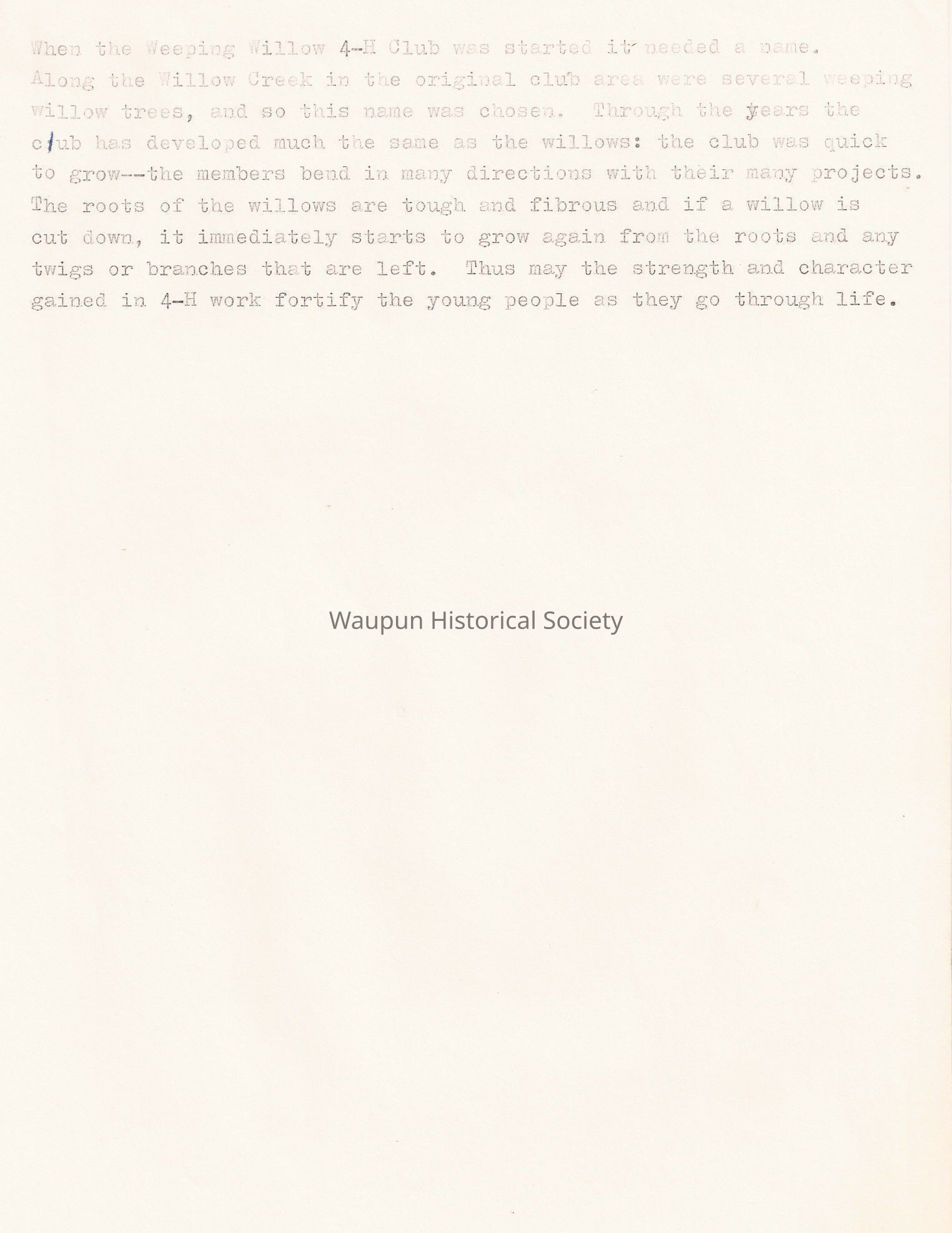 Historical information on Waupun Weeping Willow 4-H Club for 1976 Bicentennial Celebration in Waupun, WI.