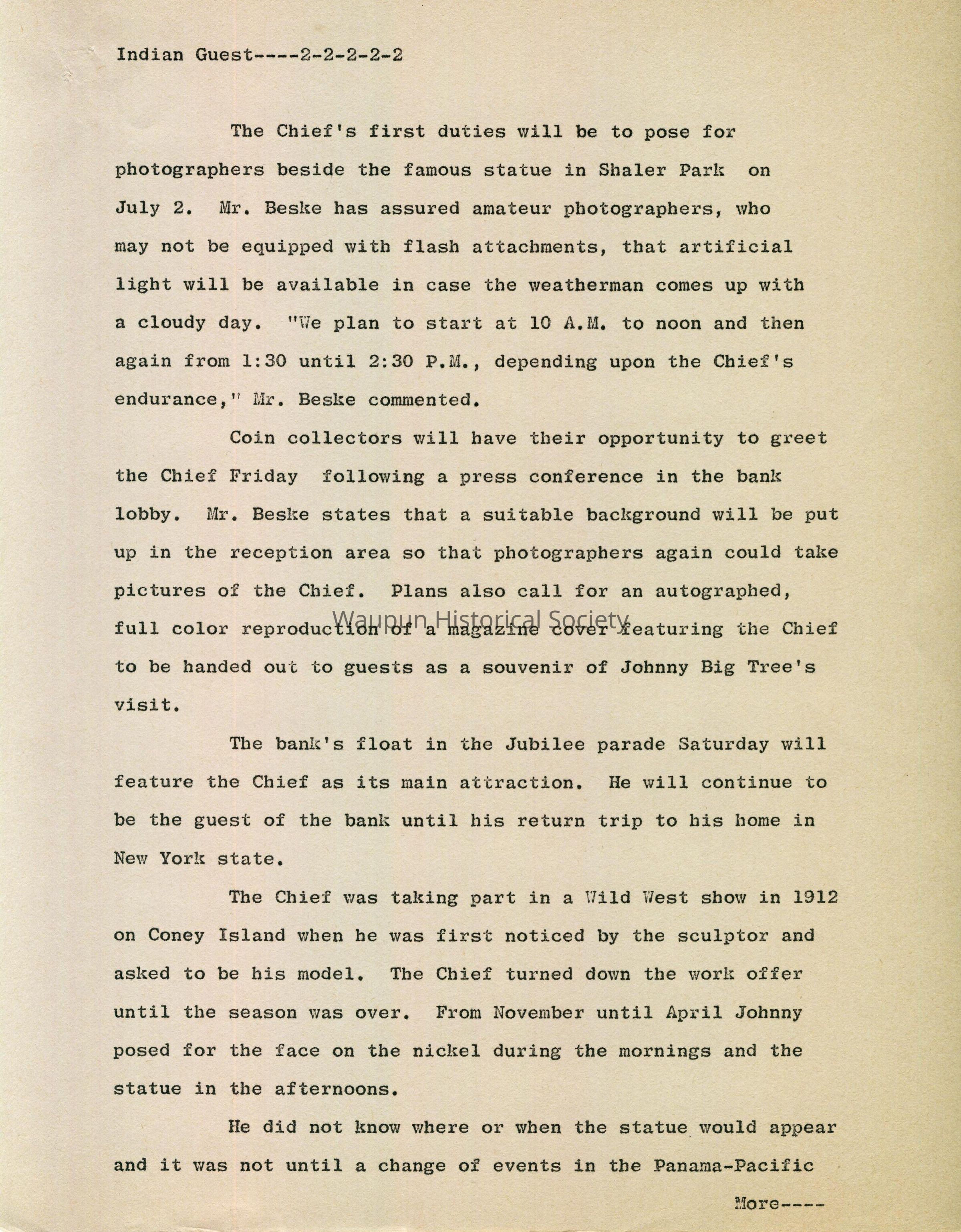 Waupun's 125th Jubilee, News Release, Guest, Chief John Big Tree, 1964Entry/Object ID