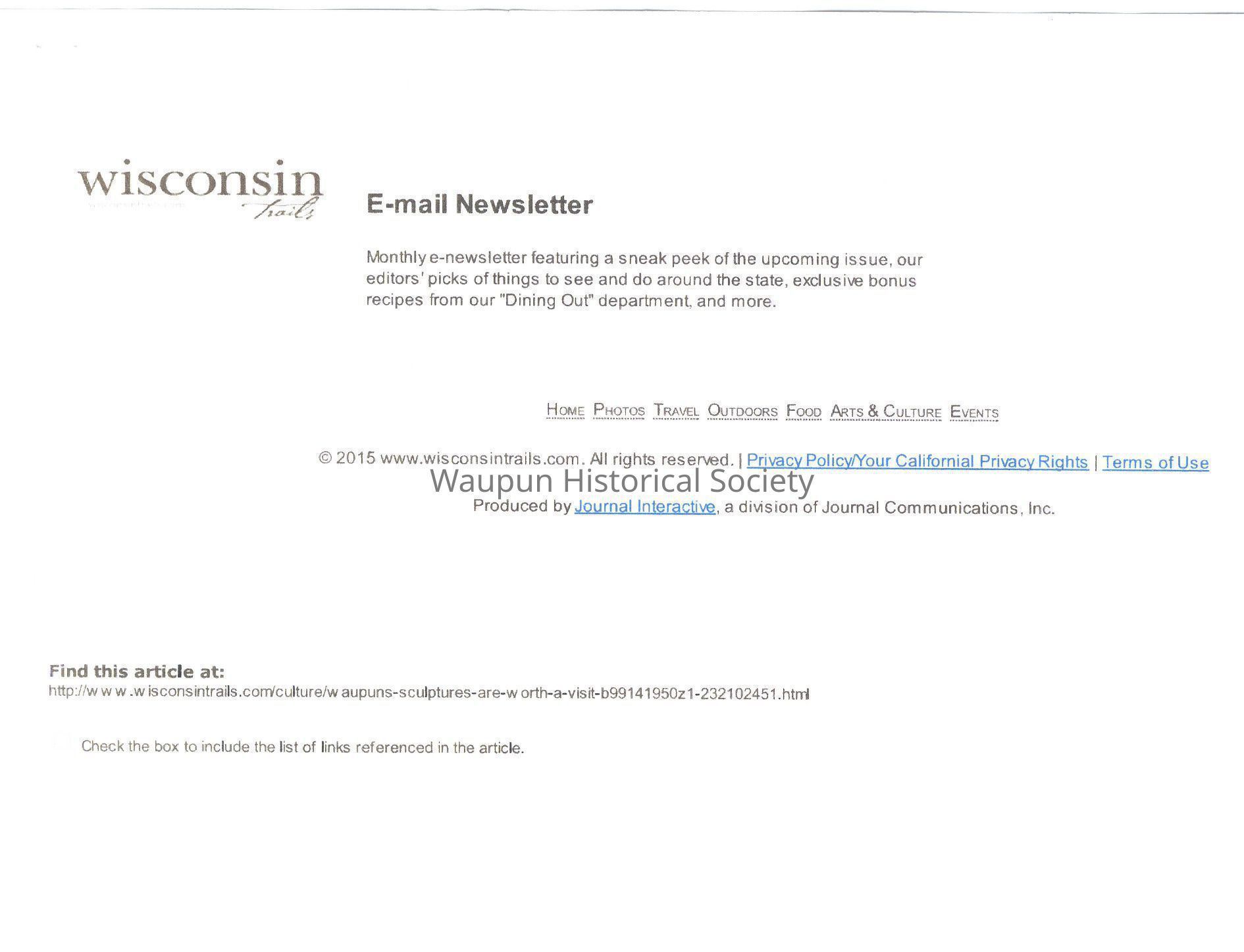 Information about Waupun's sculptures sent by way of an email dated November 23, 2015 to the Waupun Historical Society.